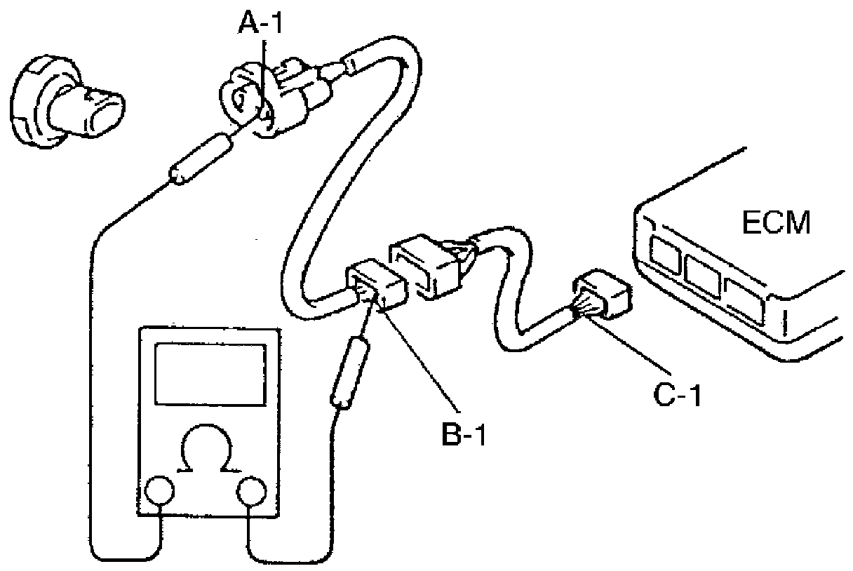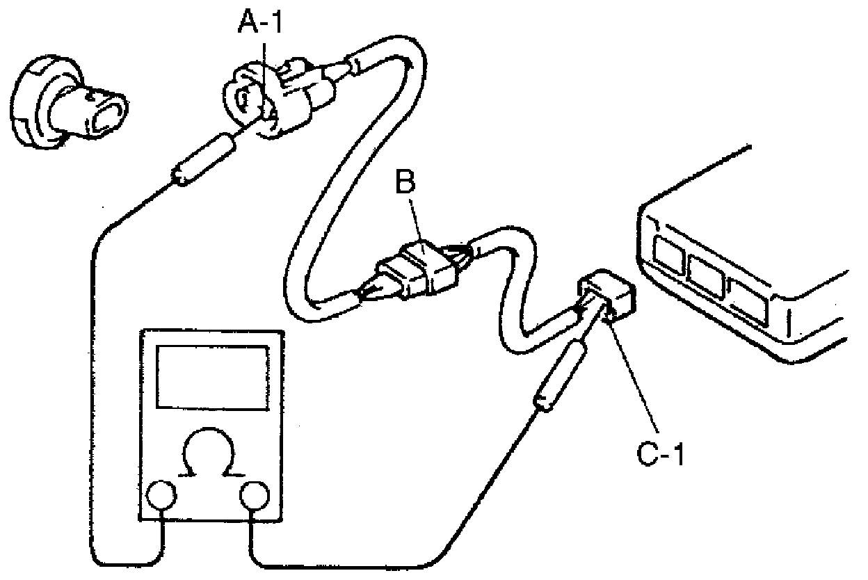 If no continuity is indicated, that means that the circuit is open between terminals "A-1" and "B-1". If continuity is indicated, there is an open circuit between terminals "B-1" and "C-1" or an abnormality in connector-B.