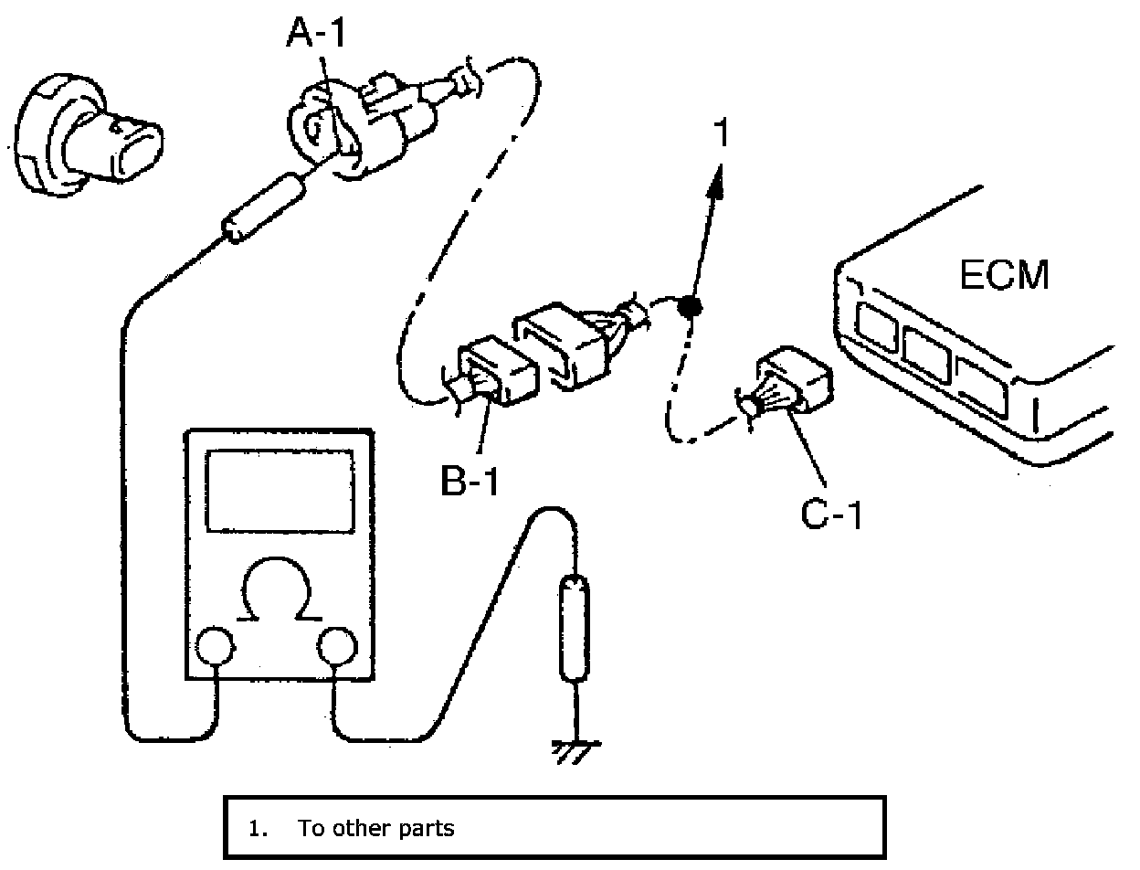NOTE: If the circuit to be checked is connected to other parts (1), disconnect all connectors of those parts. Otherwise, diagnosis will be misled.