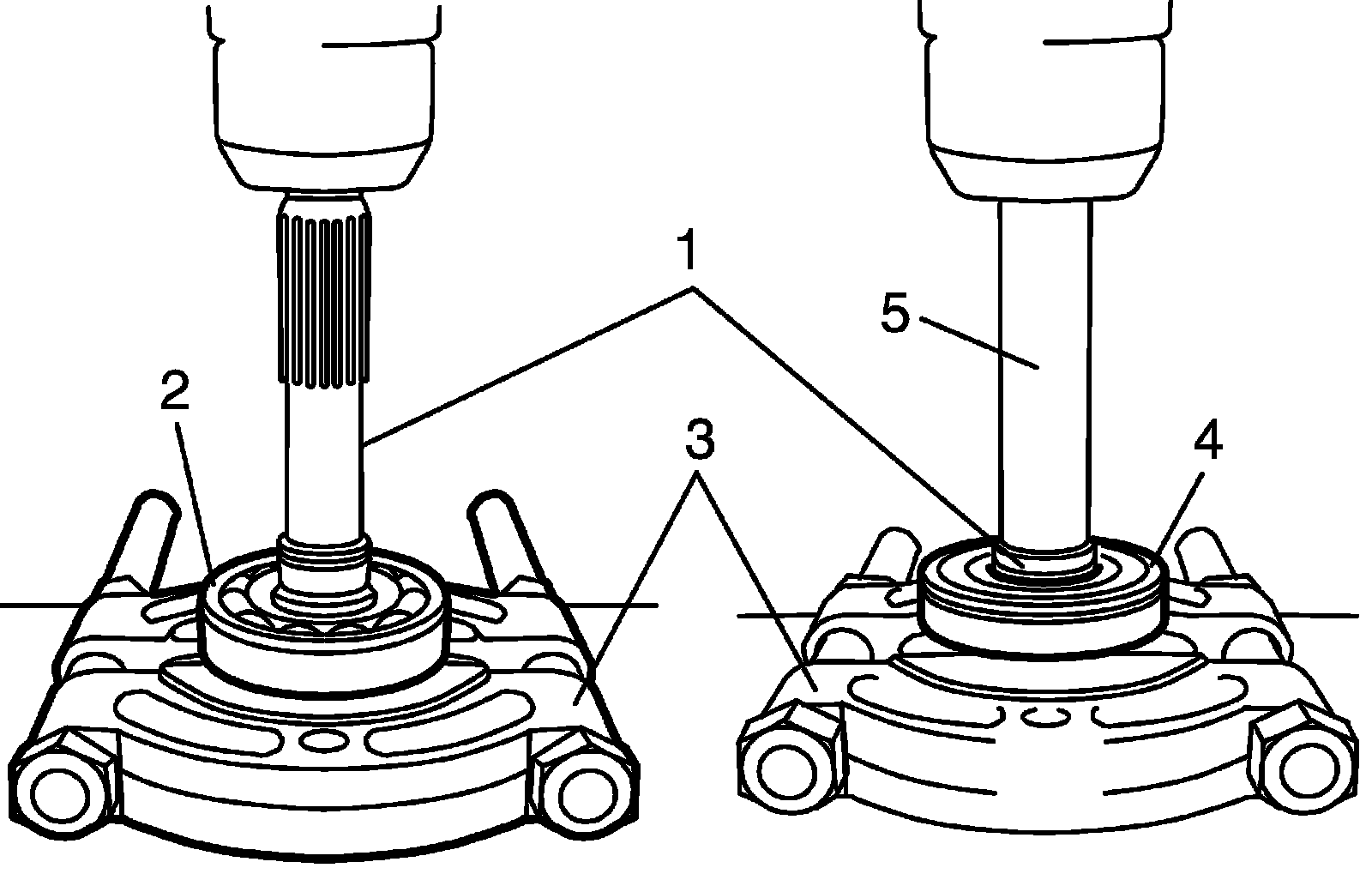 2) Remove input shaft right bearing (2) and left bearing (4) from input shaft (1) using bearing puller (3) and hydraulic press.