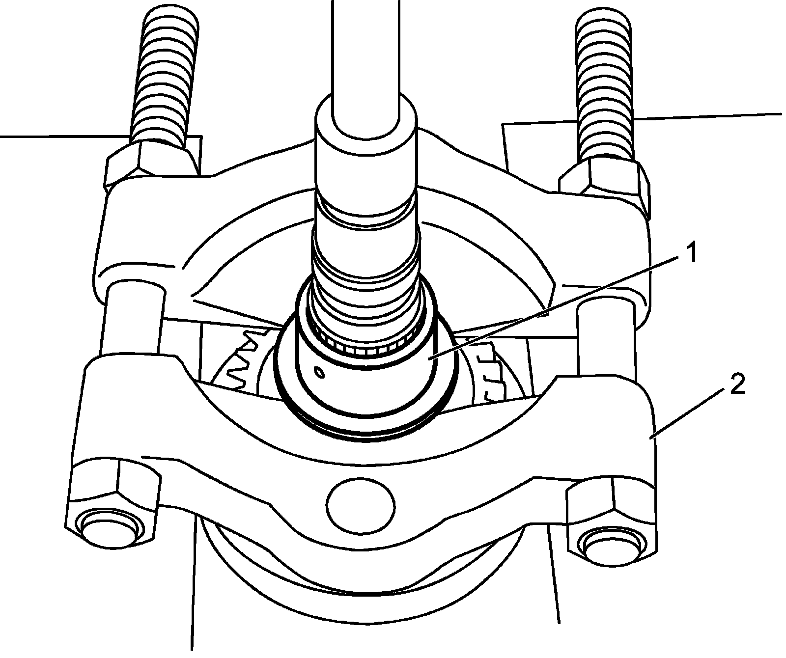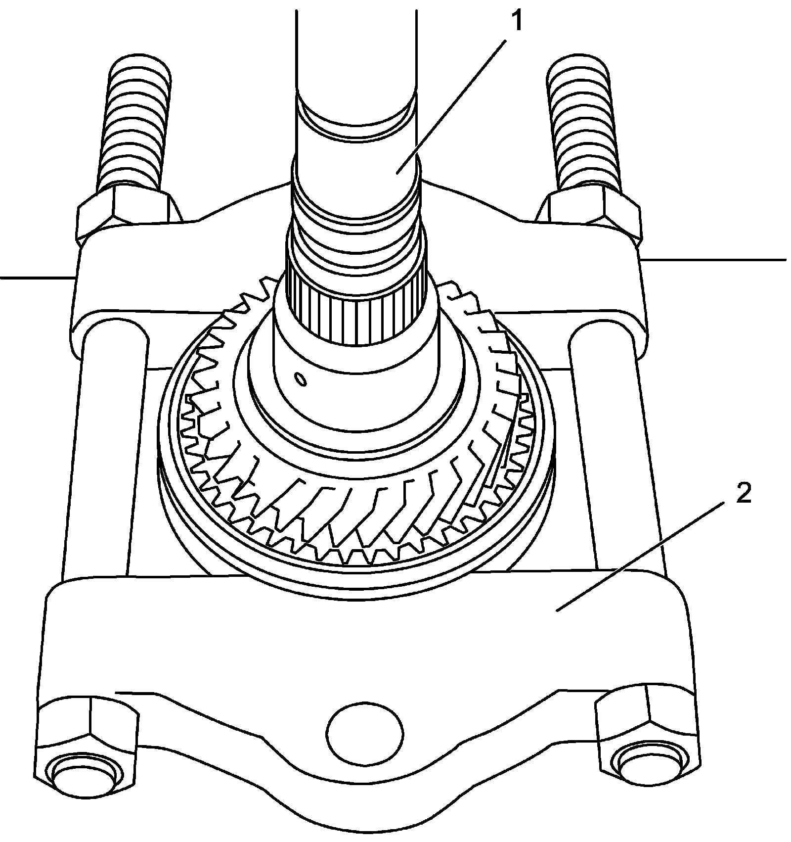 c) Drive out 5th gear spacer (1) using puller (2) and hydraulic press.