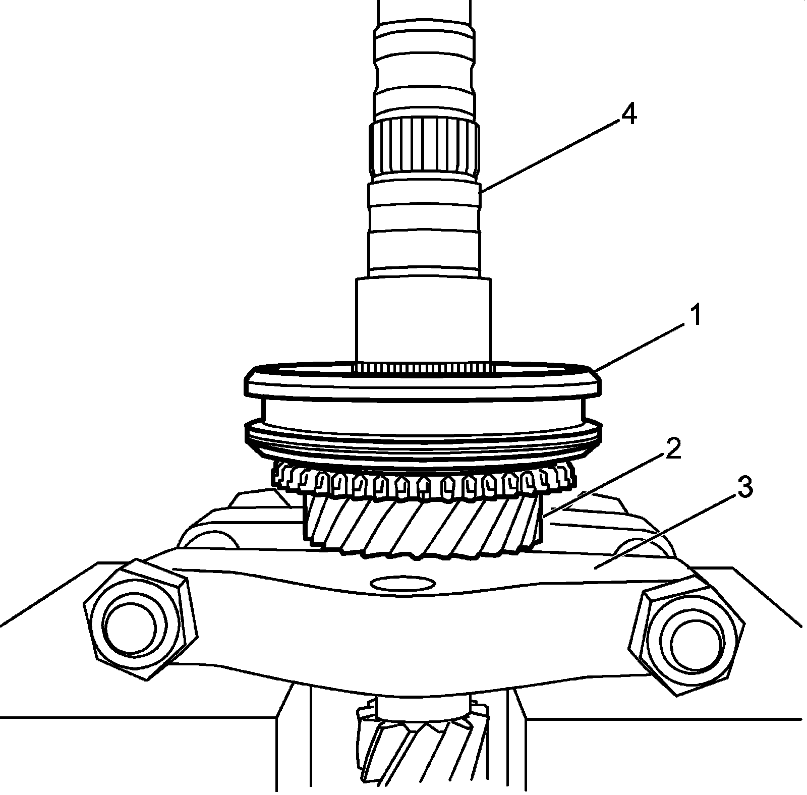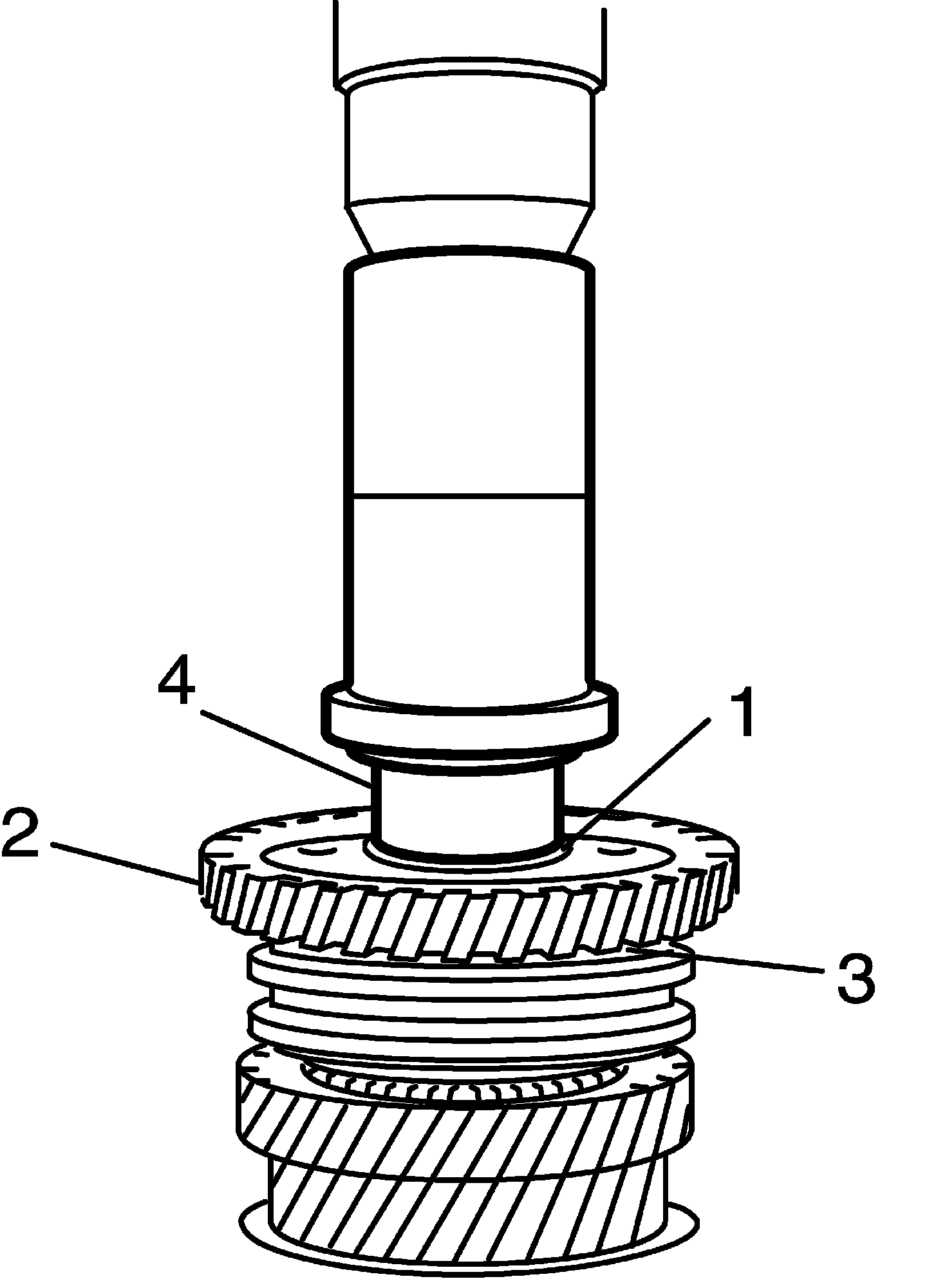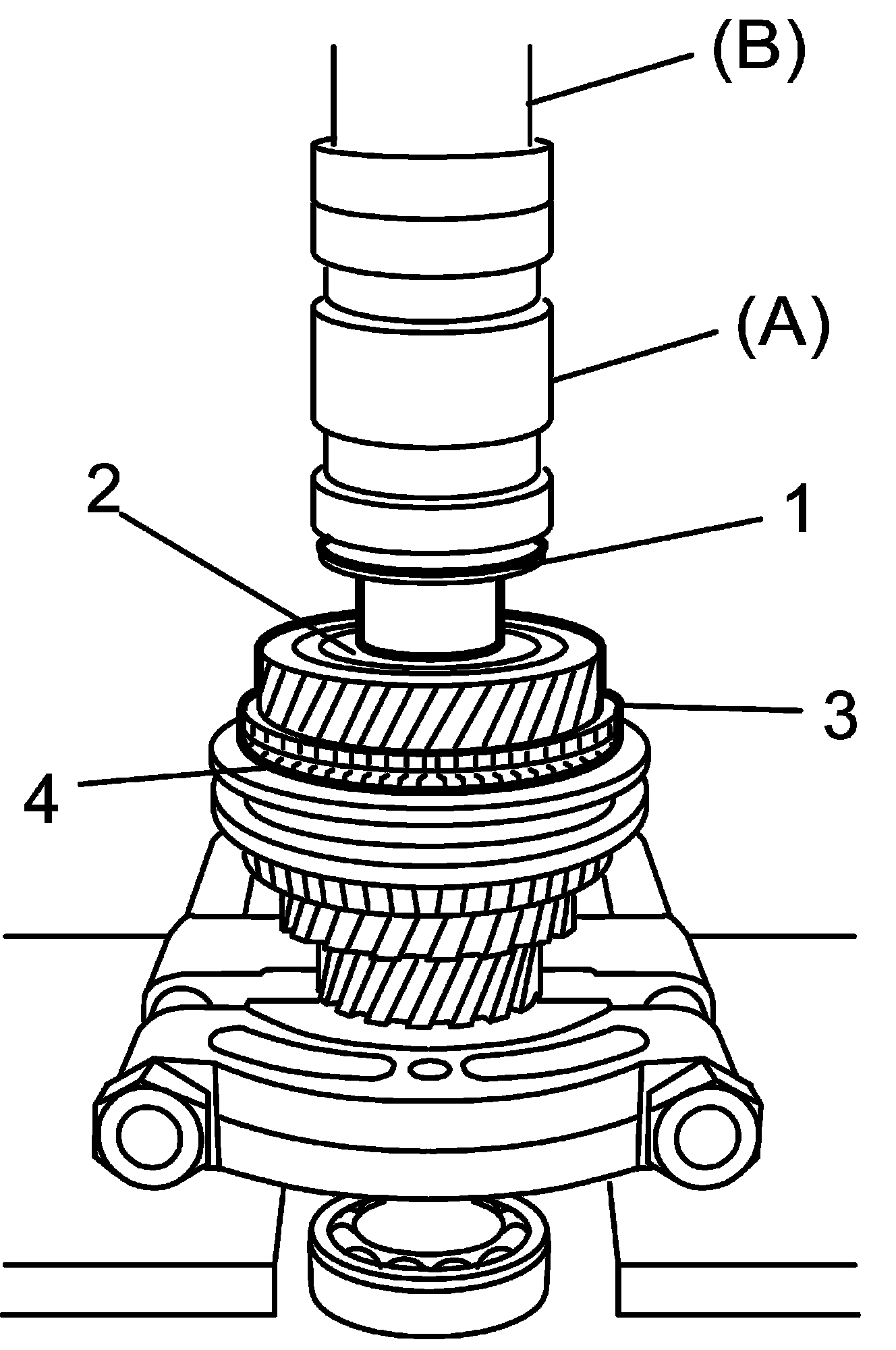 5) Install 4th gear needle bearing (2), apply oil to it, then install 4th gear (3) and synchronizer ring (4).
