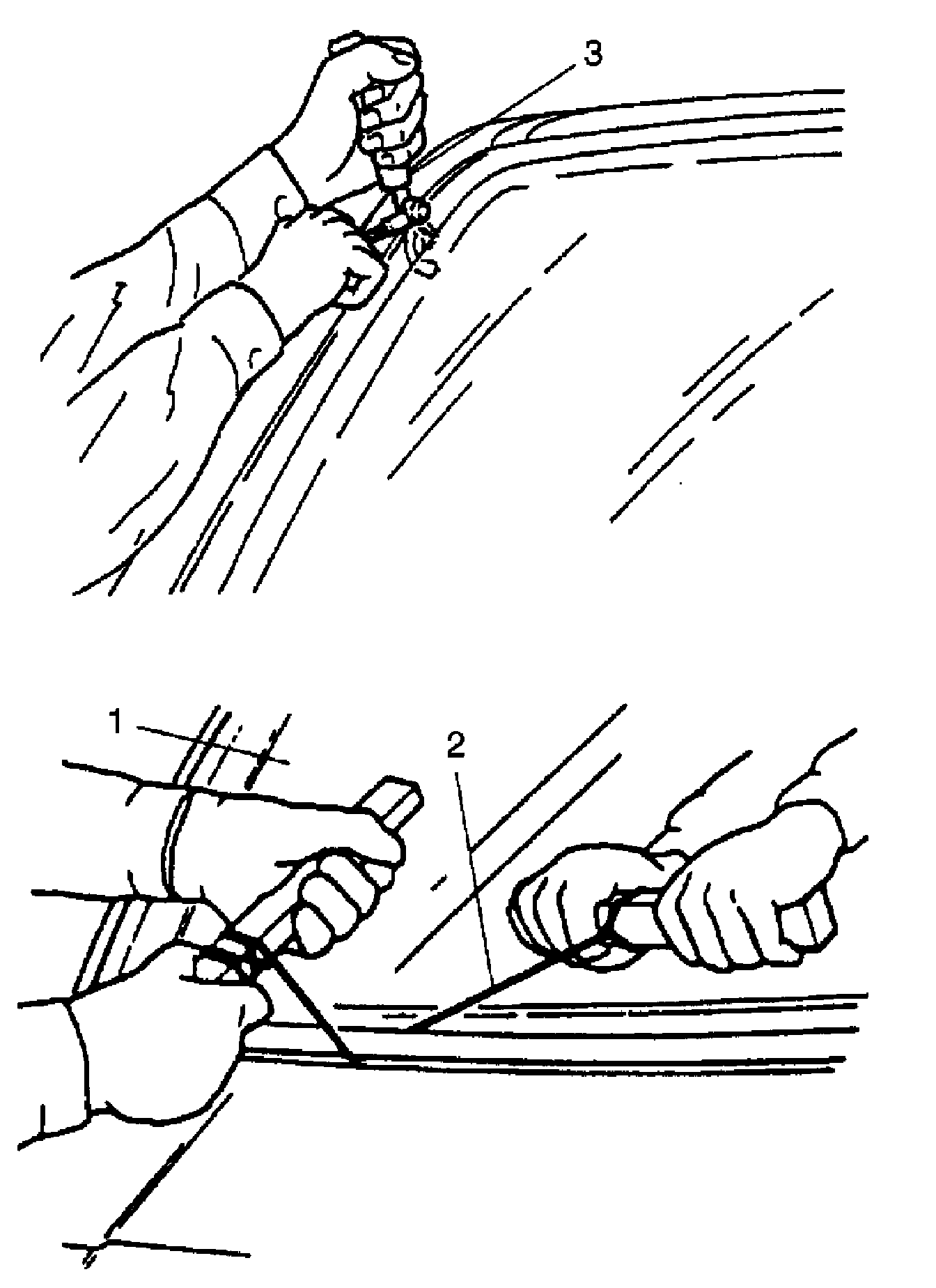 9. Cut adhesive all around windshield (1) with piano string (2). When using tool, windshield knife (3), to cut adhesive, be careful not to cause damage to windshield. Use wire to cut adhesive along lower part of windshield.