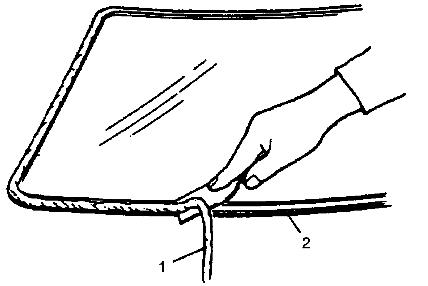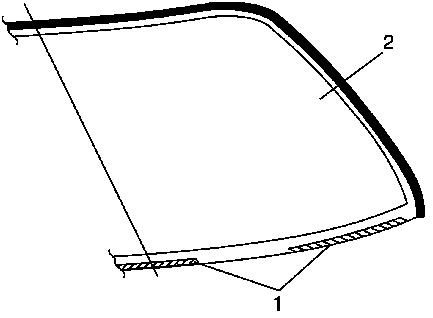 11 When reusing windshield, remove the adhesive (1) from it, using care not to damage primer coated surface (2).