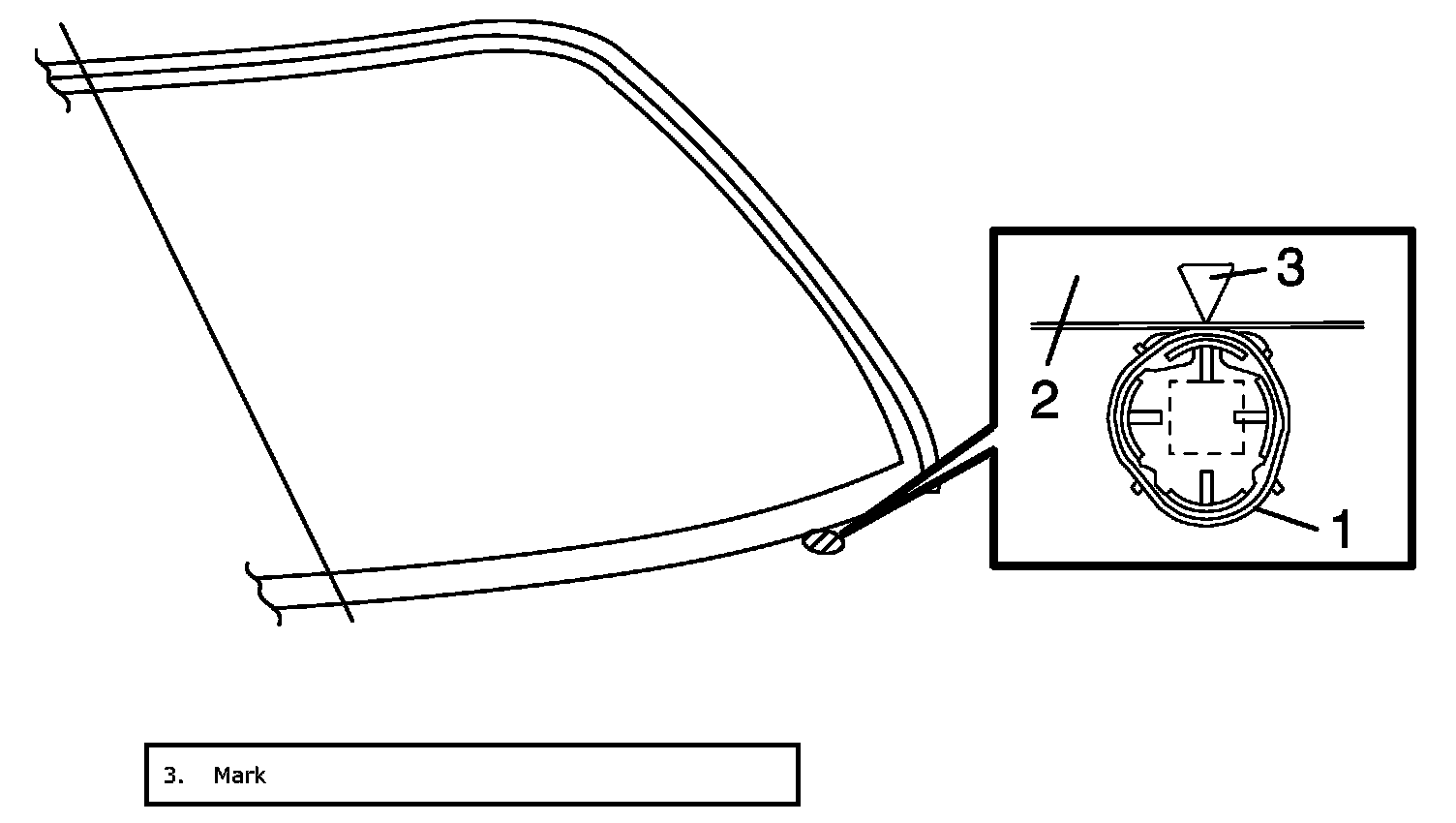 3. To determine installing position of glass (1) to body (2), position glass against body so that clearance between upper end of glass (1) and body (2) is approximately 5.5 mm (0.217 in.) and clearances between each side end (right & left) of glass (1) and body (2) are even. Then mark mating marks (3) on glass (1) and body (2) as shown. Upper clearance can be adjusted by moving glass stoppers position.