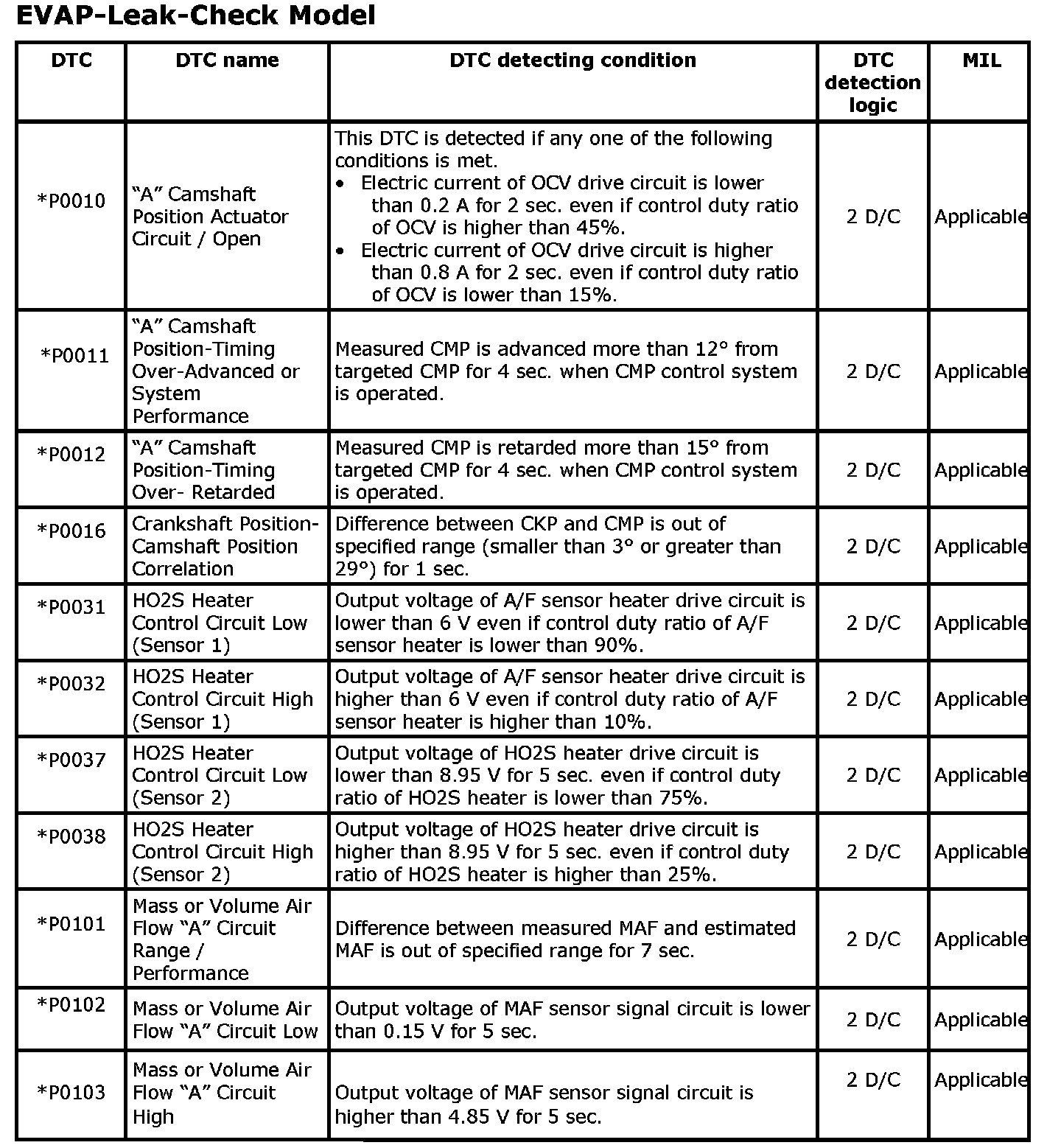 DTC Table EVAP System
