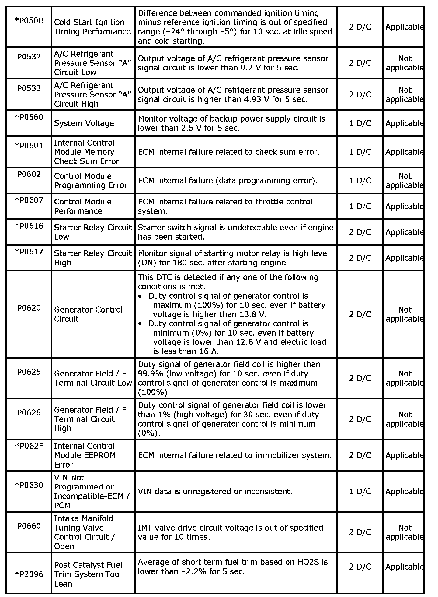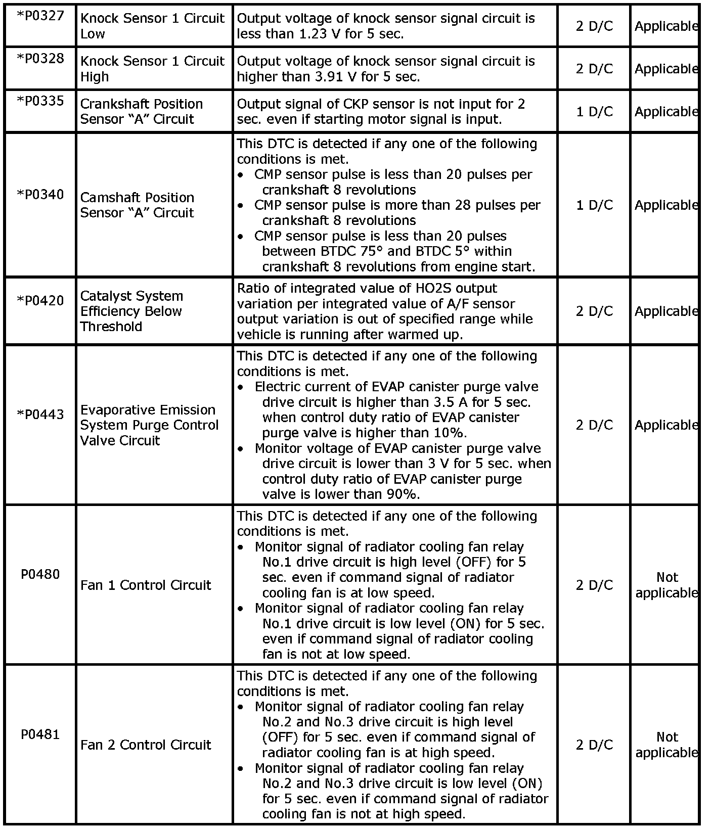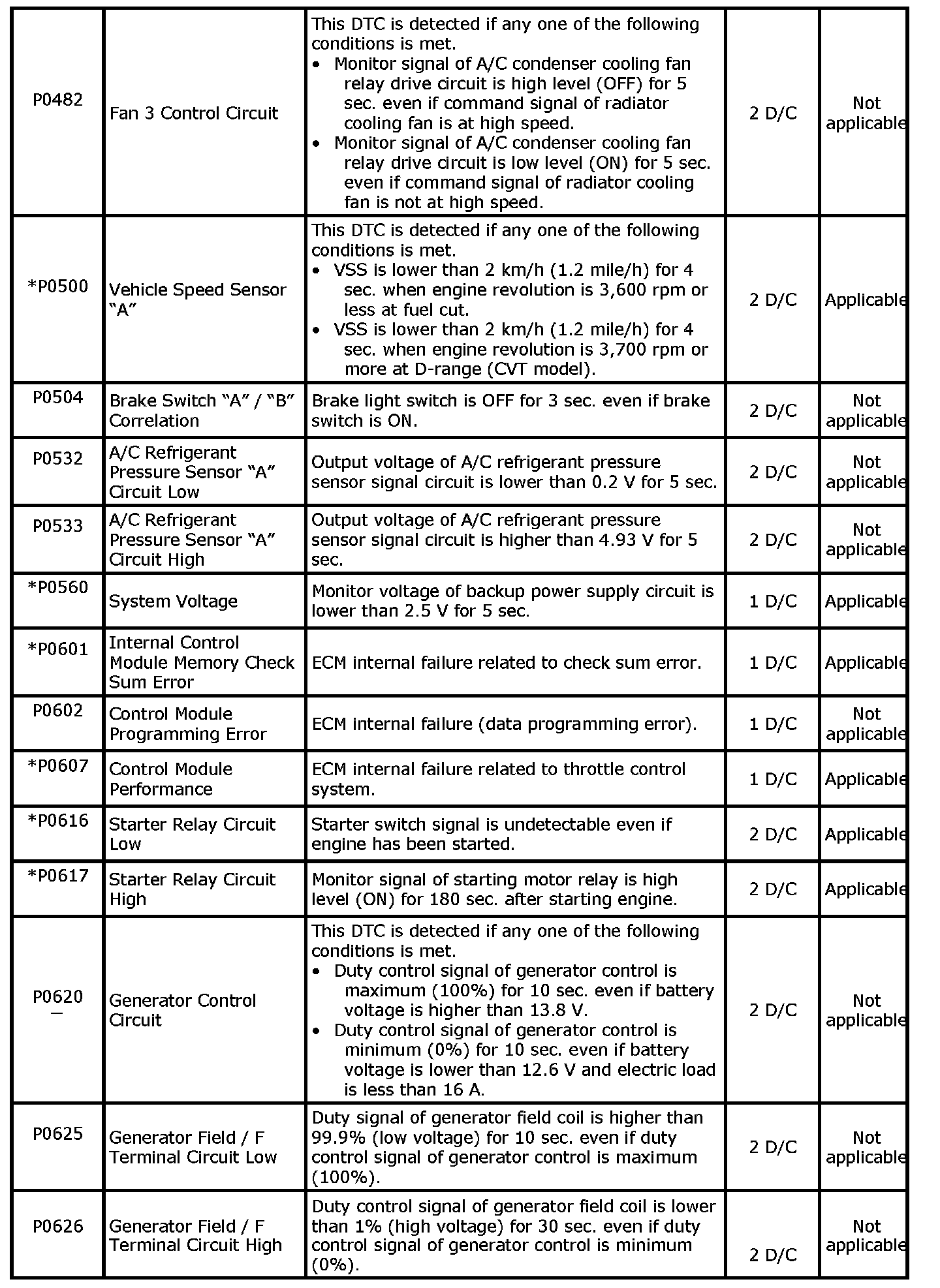 - With the CAN communication generic scan tool, only star (*) marked DTC No. in the following table can be read.