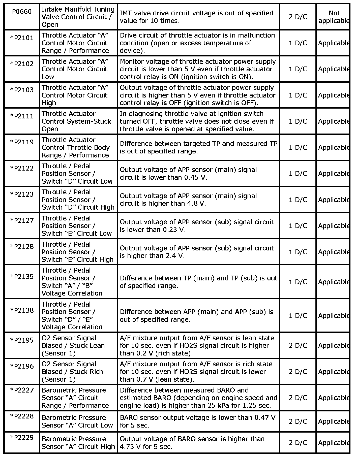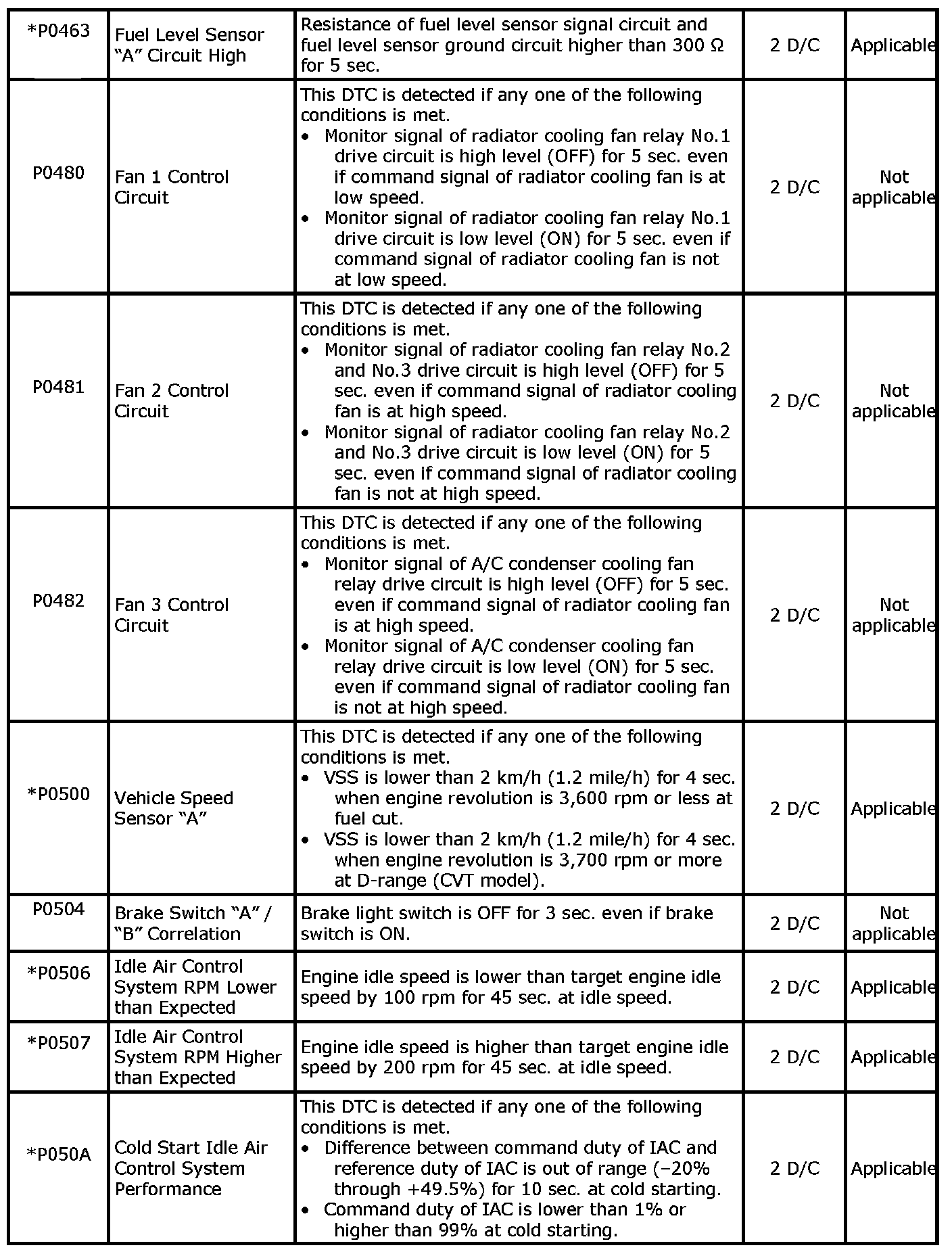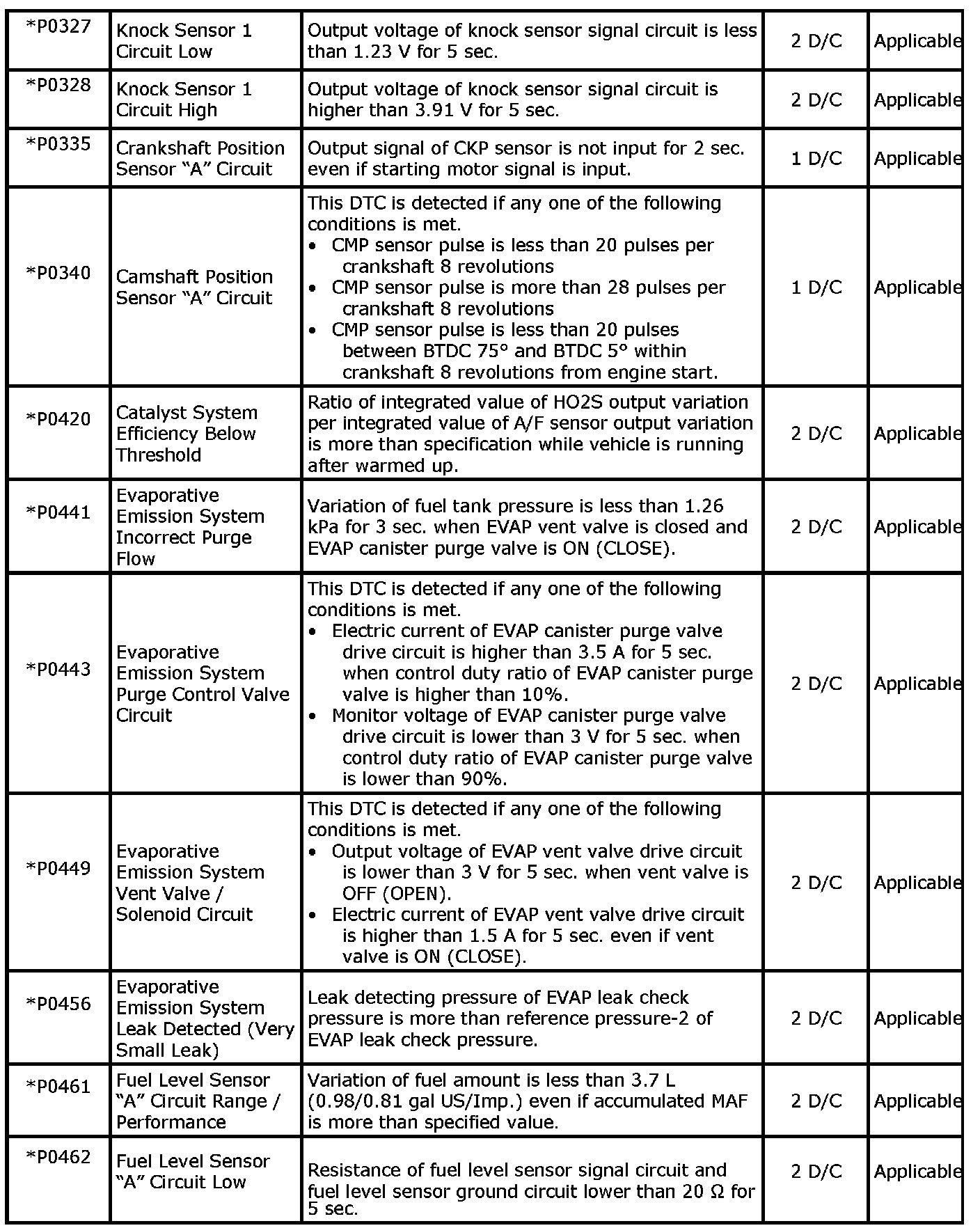 - With the CAN communication generic scan tool, only star (*) marked DTC No. in the following table can be read.