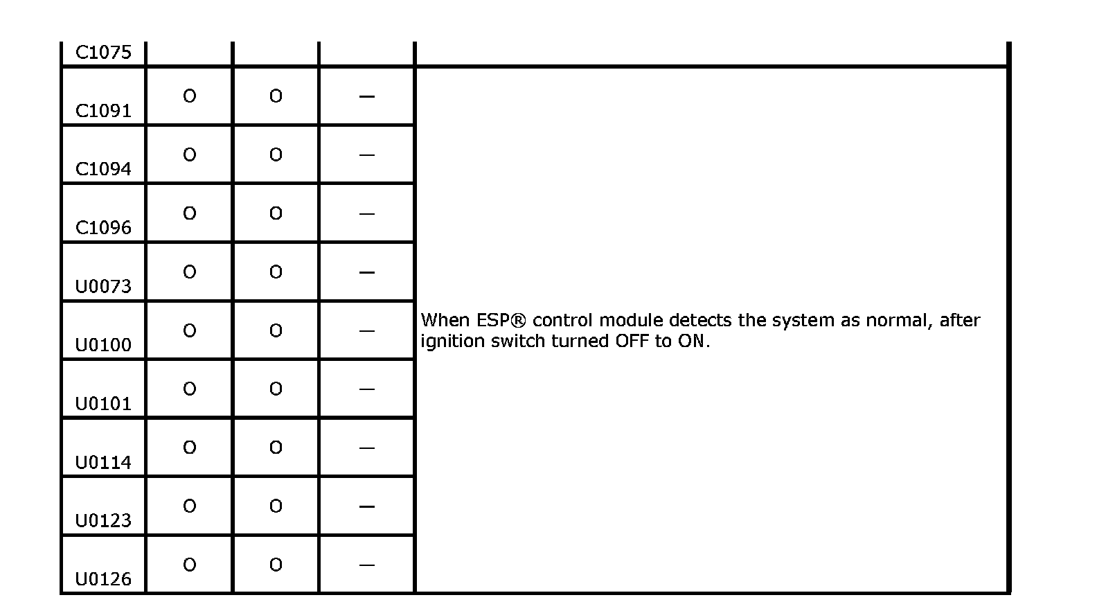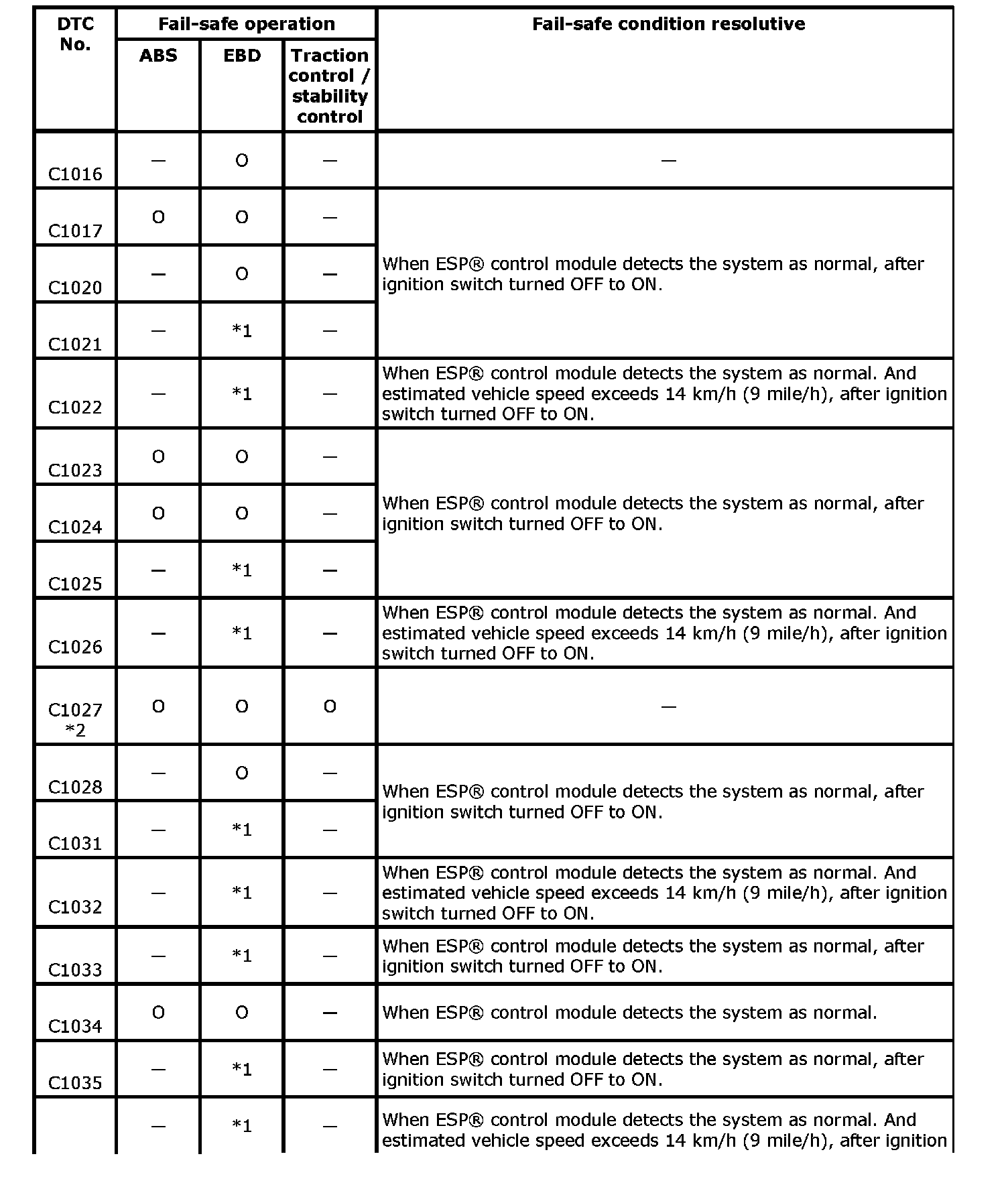 Fail-Safe TableWhen any of the following DTC(s) is detected, ESP(R) system is in fail-safe mode per its DTC and ABS, EBD, traction control, stability control are deactivated until the resolution is applied.