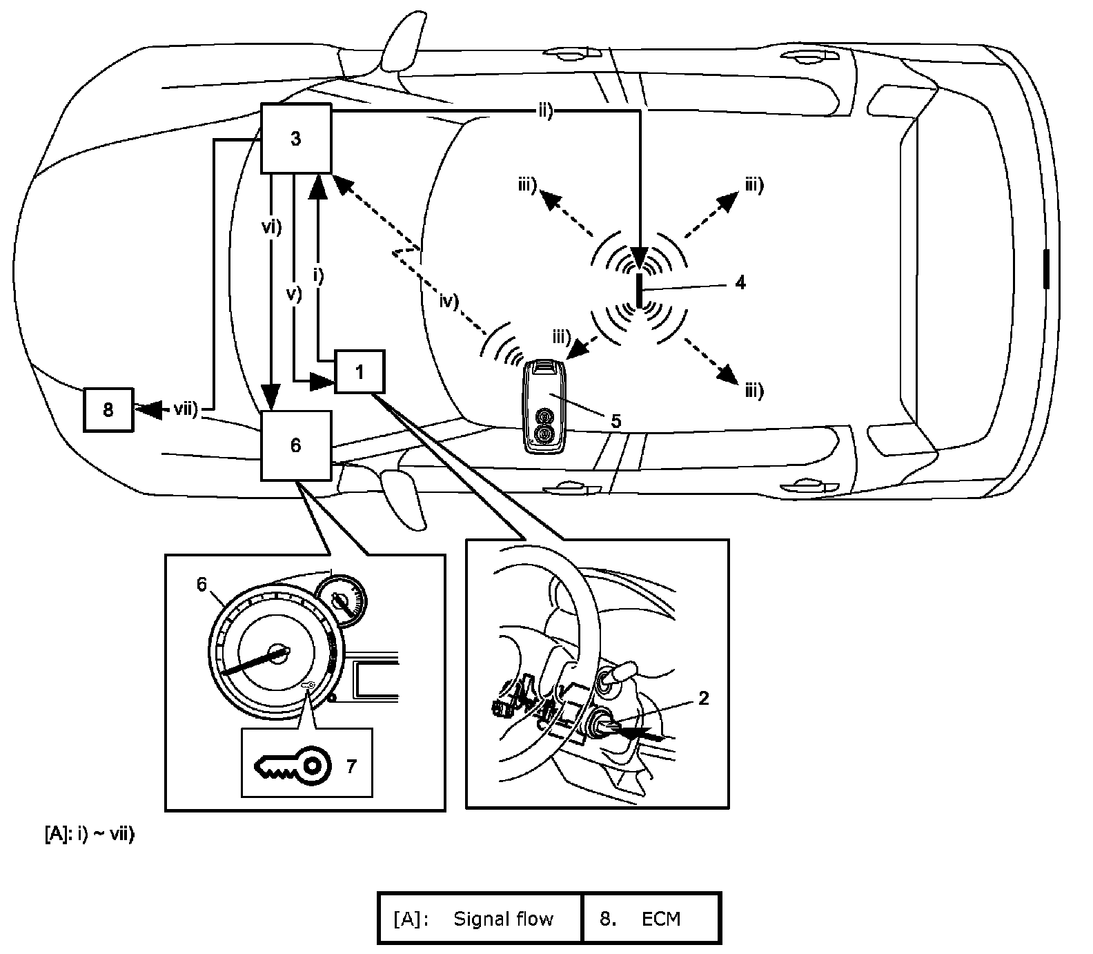 Description Of Keyless Engine Start FunctionWhen the ignition knob switch (2) installed to the steering lock unit (1) is pushed, the keyless start control module (3) activates the center antenna (4) to send out the request signal in the vehicle compartment. When the remote controller (5) receives the request signal from the center antenna, it transmits the ID code to the keyless start control module. The keyless start control module compares the ID code sent by the remote controller with the ID code registered in the keyless start control module. When these ID codes match, the keyless start control module makes the key indicator light (7) in the combination meter (6) light in blue and unlocks the steering lock unit to enable the ignition knob switch to turn. When the ignition knob switch is turned to ON position in this state, ID codes of ECM and keyless start control module are compared through CAN communication (immobilizer function). When they match, turning the ignition knob switch to start position will start the engine.
