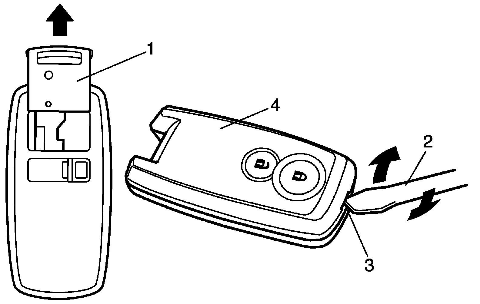 2. With tip of flat blade screwdriver (2) put in slot (3) of remote controller (4), pry it open.
