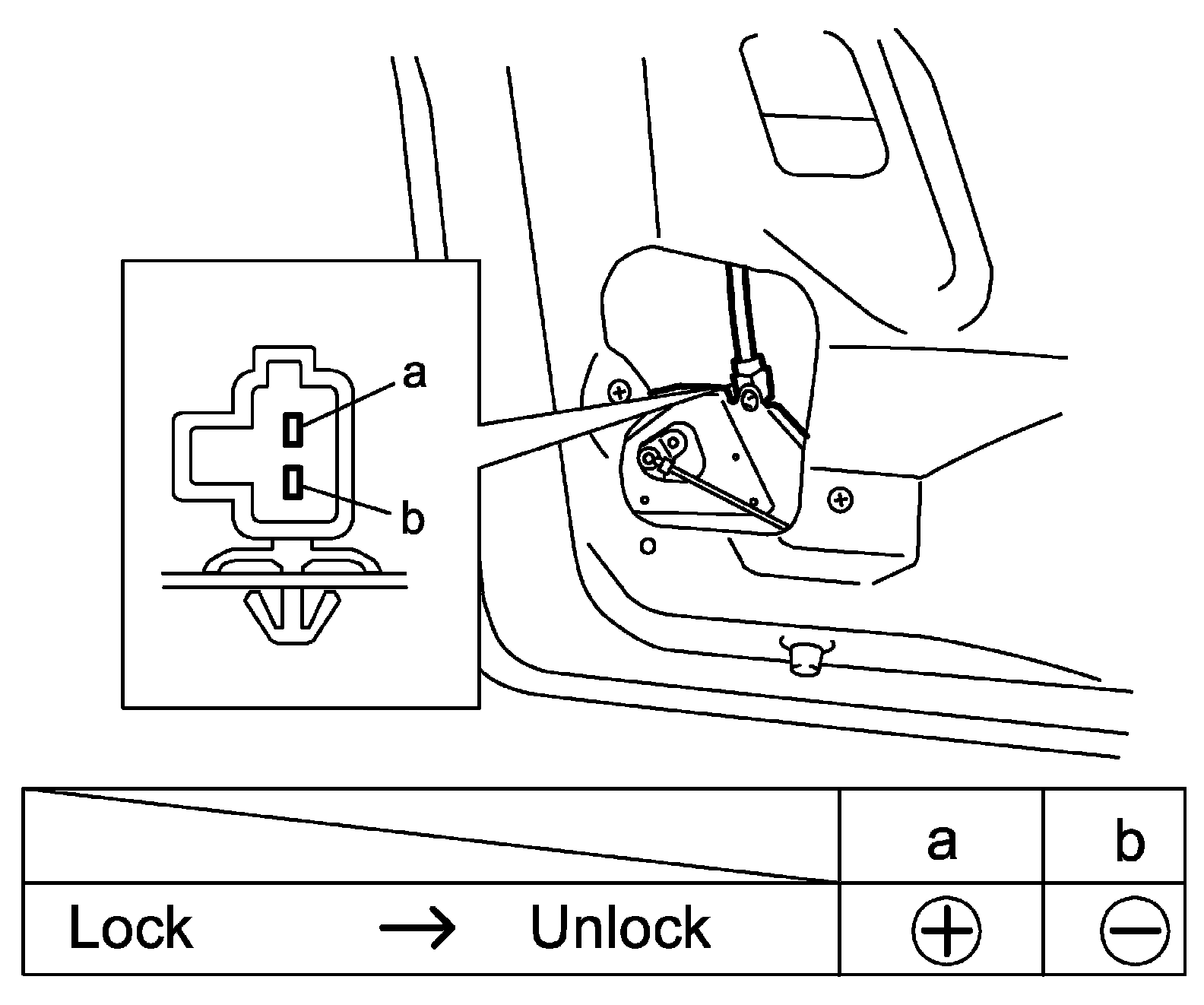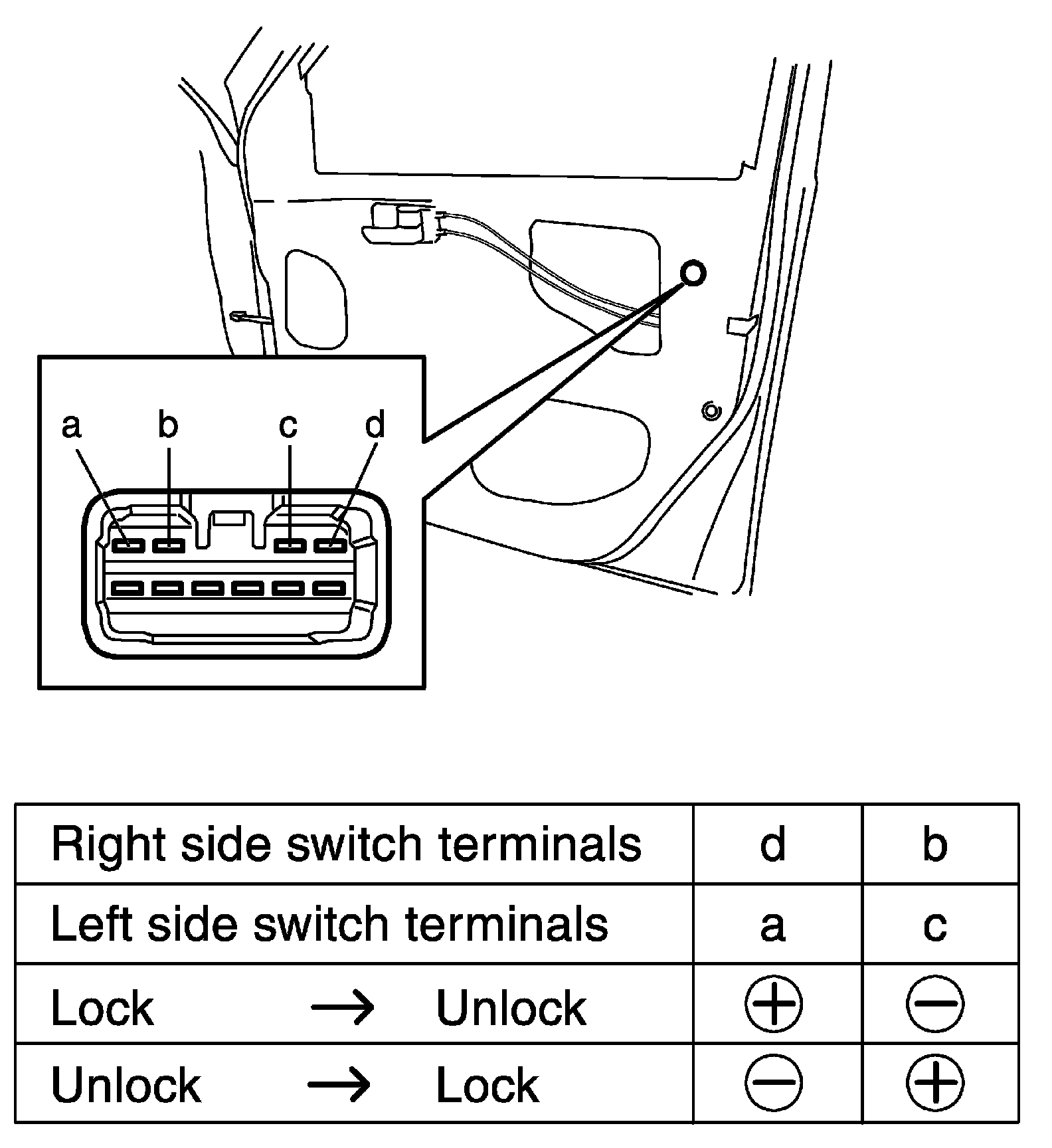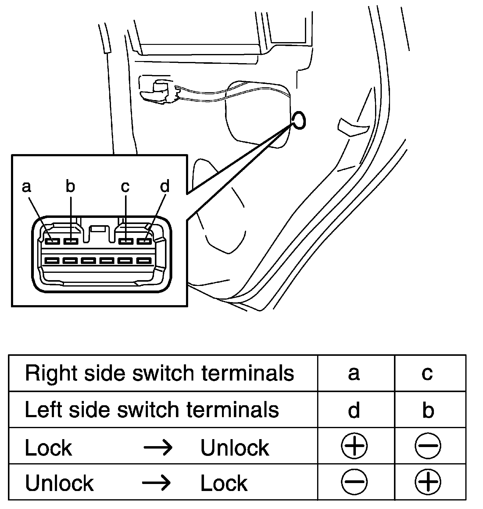 3. Connect battery positive (+) and negative (-) terminals to the door lock actuator terminals (a, b, c, d) as shown in figure.