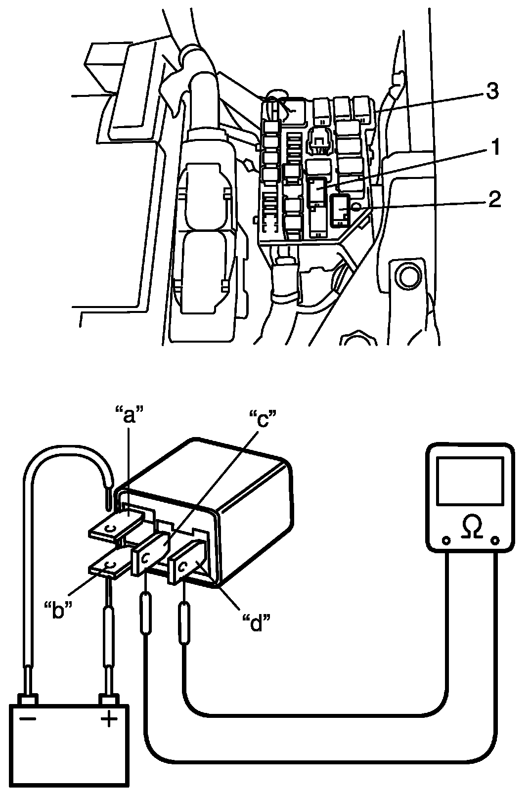 4. Connect battery positive (+) terminal to terminal "b" of relay and battery negative (-) terminal to terminal "a" of relay, and then check continuity between terminal "c" and "d". If there is no continuity, replace relay.