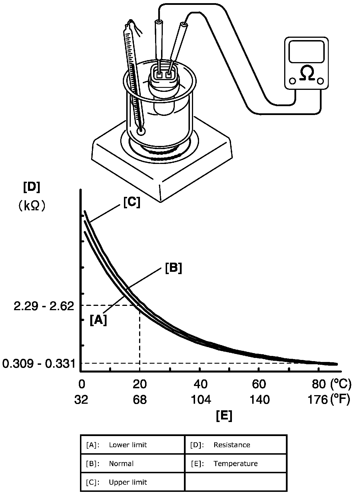 Engine Coolant Temperature (ECT) Sensor InspectionImmerse temperature sensing part of ECT sensor in water (or ice) and measure resistance between sensor terminals while heating water gradually.