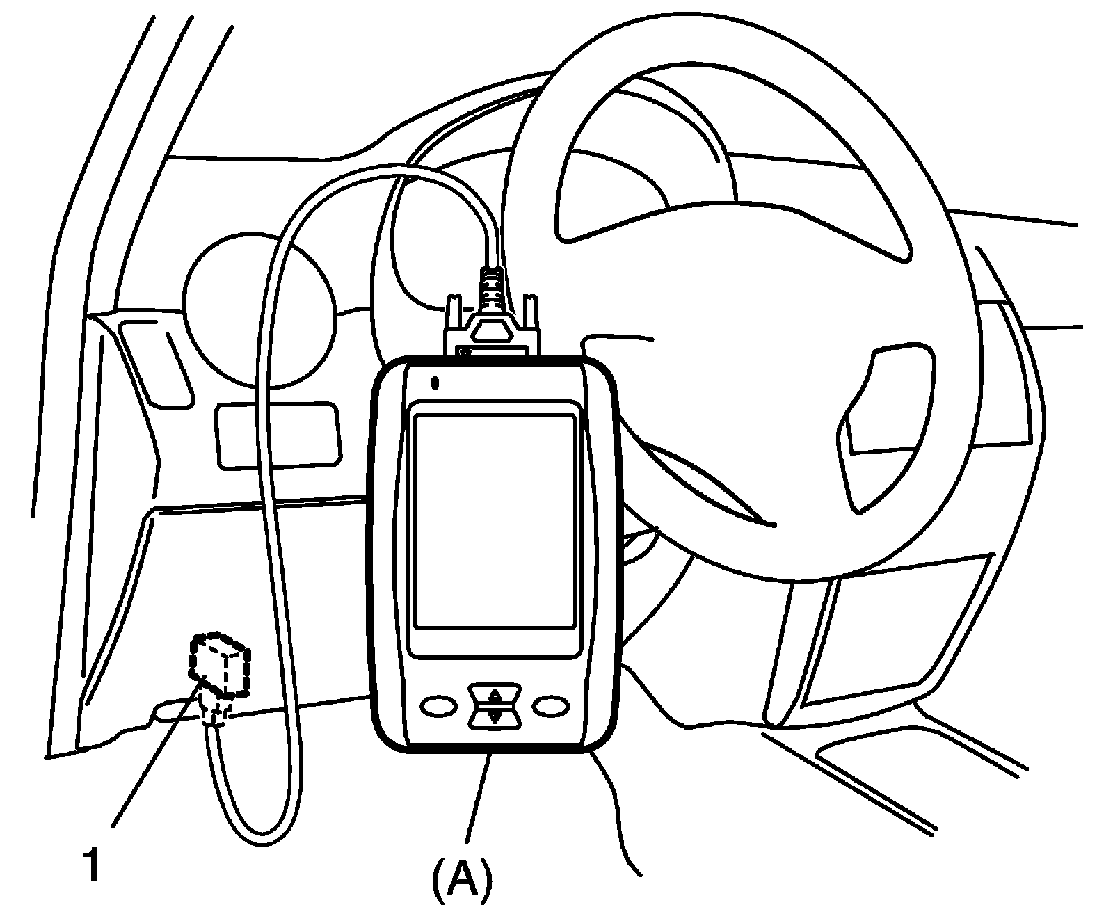 2. With ignition switch turned OFF, connect it to DLC (1) located on underside of instrument panel at driver's seat side.