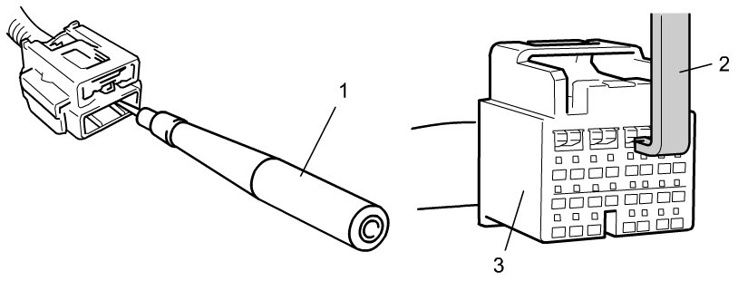The adapter (1) will also give an idea of whether or not contact tension is sufficient, helping to find an open or intermittent open due to poor terminal contact. SDM shorting bar release tool (2) is included in connector test adapter kit. Inserting it into SDM connector (3) will release shorting bar.