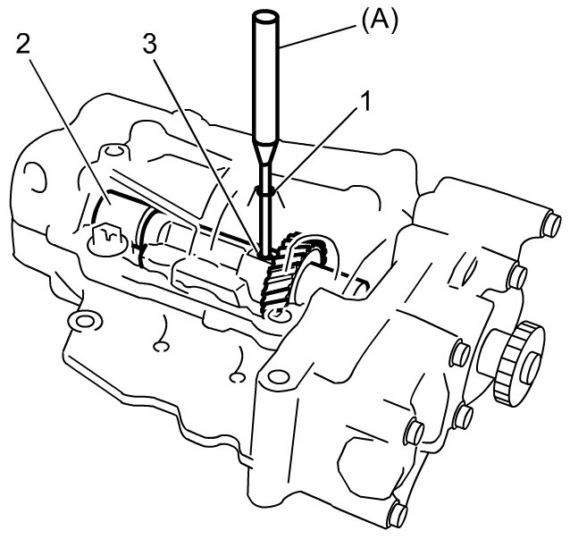 8) Insert special tool to aligning hole (1) on oil pump housing and make sure the position of aligning hole (3) on balancer shaft No.1 (2) is proper.