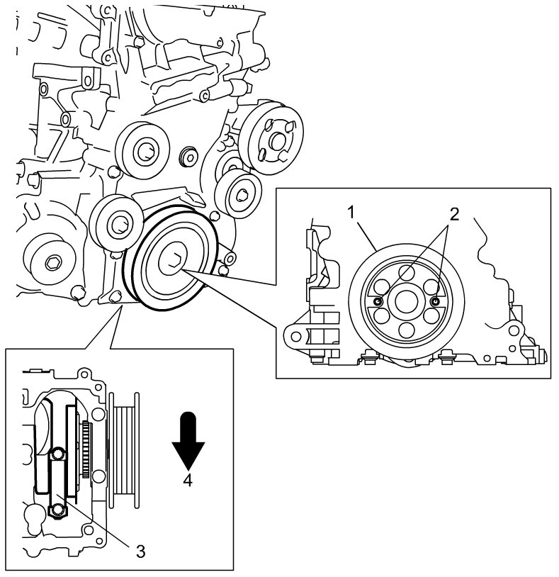 - Threaded holes (2) on crankshaft pulley (1) and lower crank case contact surface are aligned parallel.