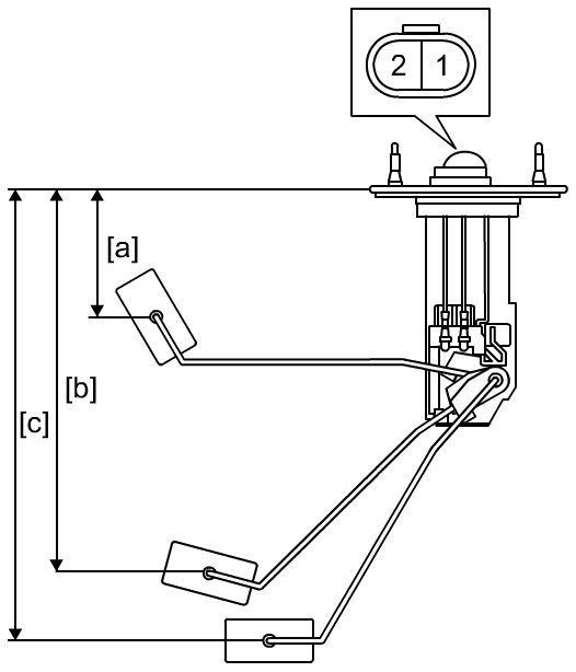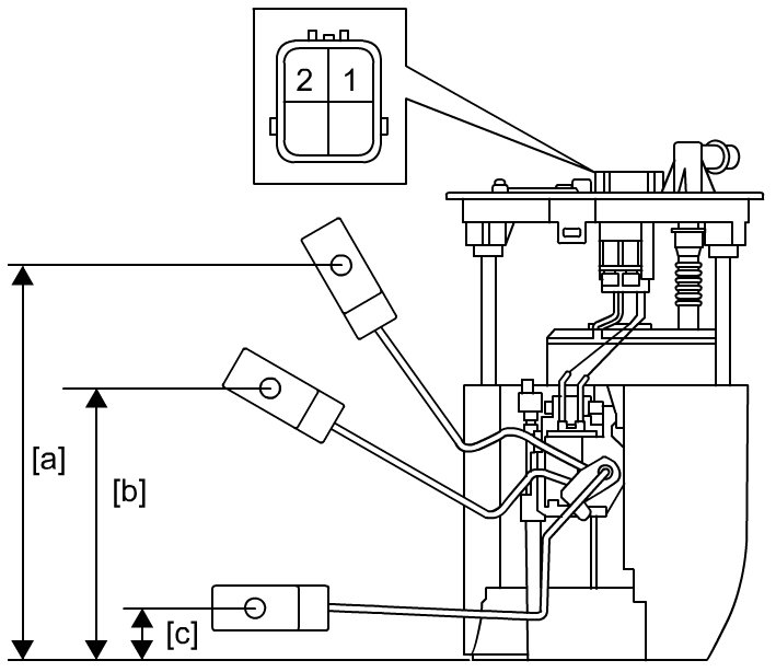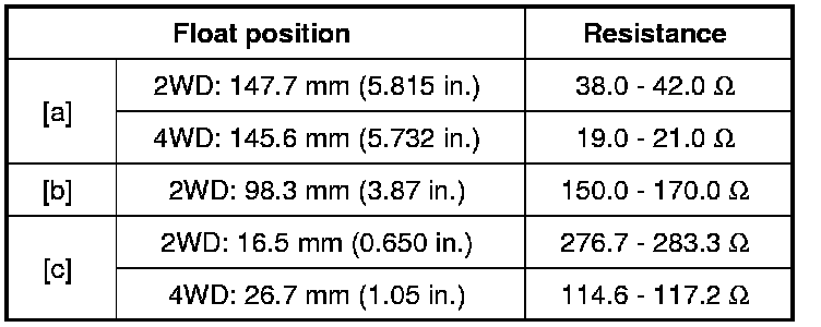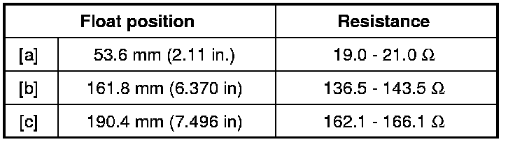 Check resistance between terminals (1) and (2) at each float position [a], [b] and [c].