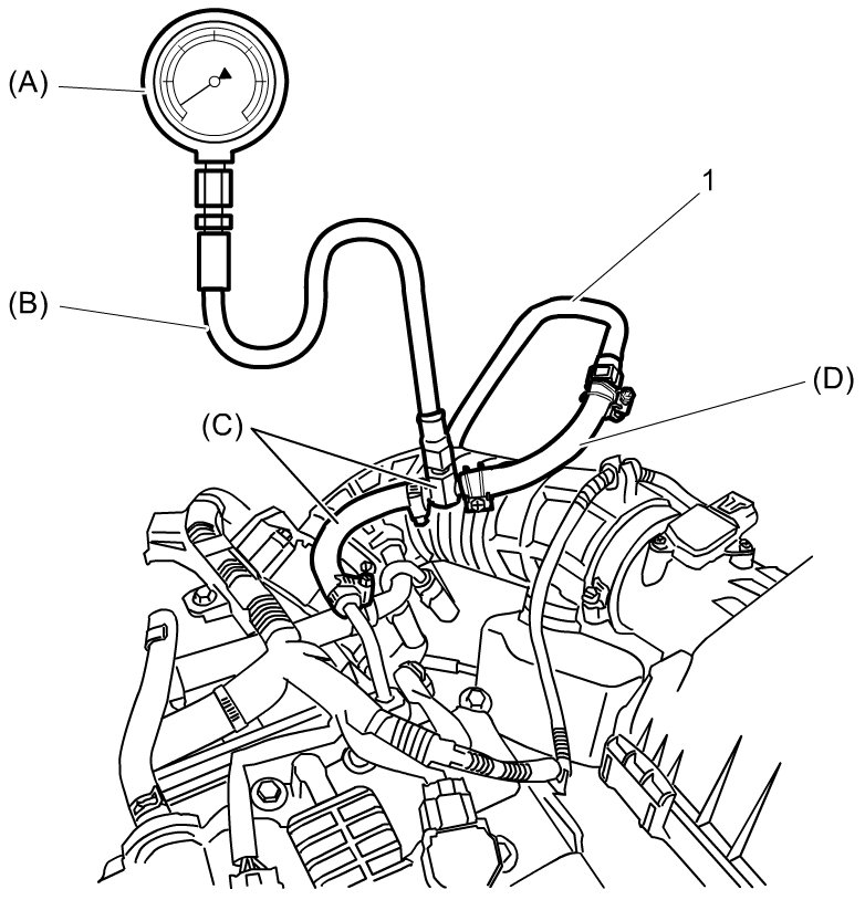 3) Connect special tools between fuel feed pipe (1) and fuel delivery pipe as shown in figure.