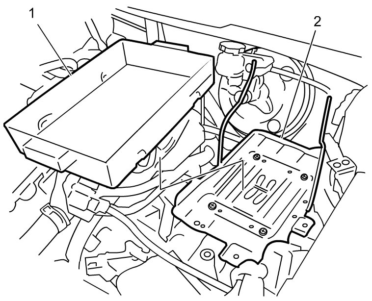 6) Remove battery bracket (2) by removing air cleaner assembly Air Cleaner Assembly Removal and Installation