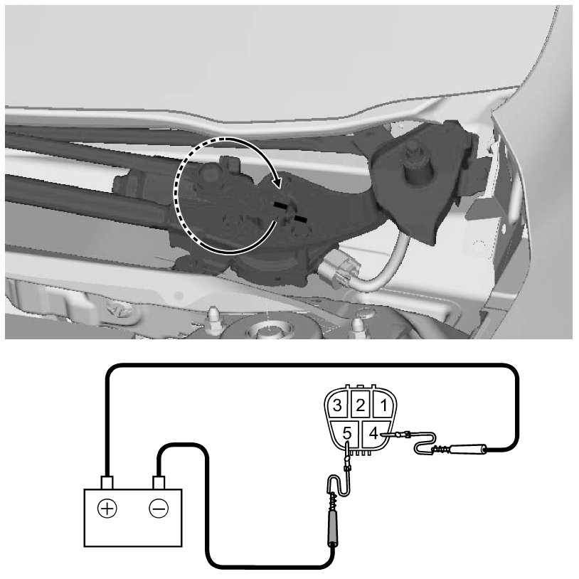 c) Connect jumper between terminals "3" and "1" of wiper motor connector. Then connect lead from battery positive (+) terminal to terminal "2" of wiper motor connector and connect lead from battery negative (-) terminal to terminal "5" of wiper motor connector. Check that wiper motor starts rotating again and then stops when marks are aligned.