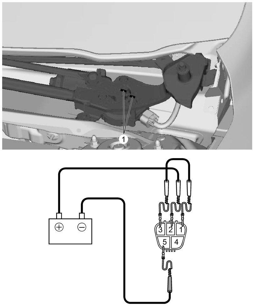 a) Connect lead from battery positive (+) terminal to terminal "1" of wiper motor connector. Connect lead from battery negative (-) terminal to terminal "5" of wiper motor connector. Wiper motor will start rotating.
