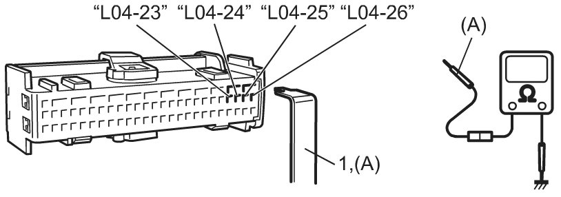 Measure resistance between "L04-25" terminal and body ground, and between "L04-26" terminal and body ground (for DTC B1237).