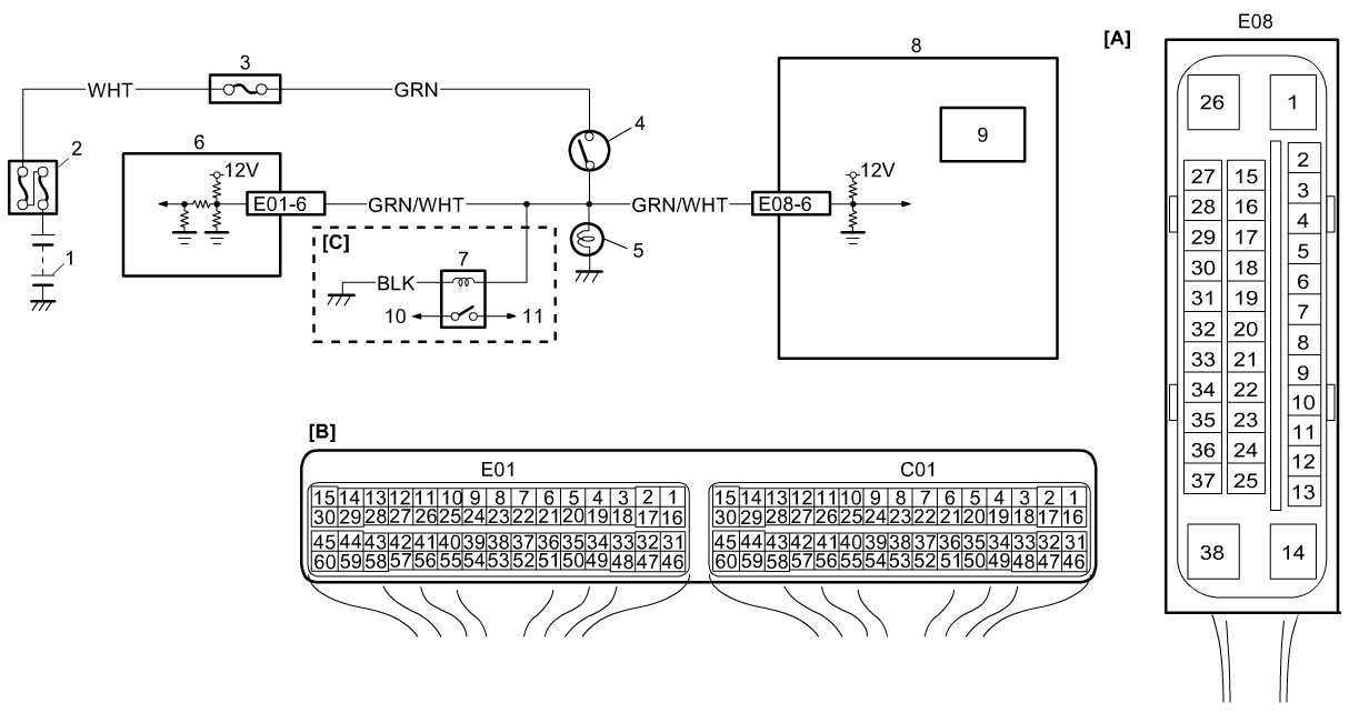 - Resistance between "GRN/WHT" wire terminal of brake light switch connector and vehicle body ground is infinity (ground short check)