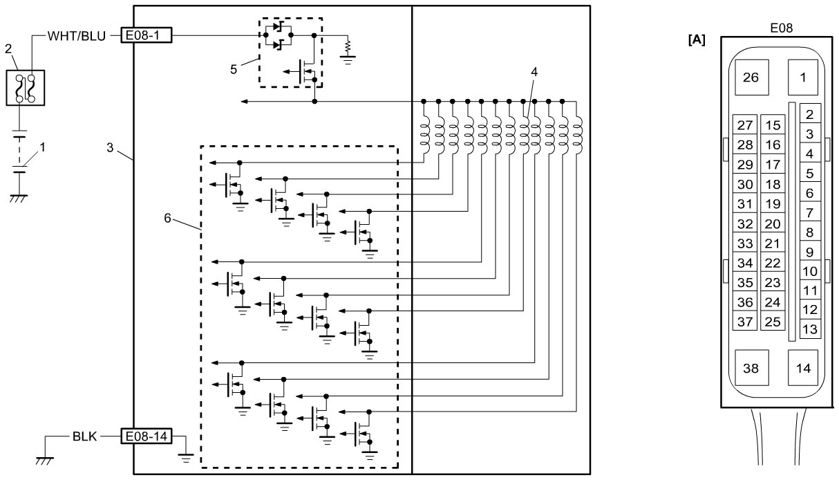 If OK, then measure voltage between terminals "E08-1" and "E08-14" of ESP(R) control module connector.