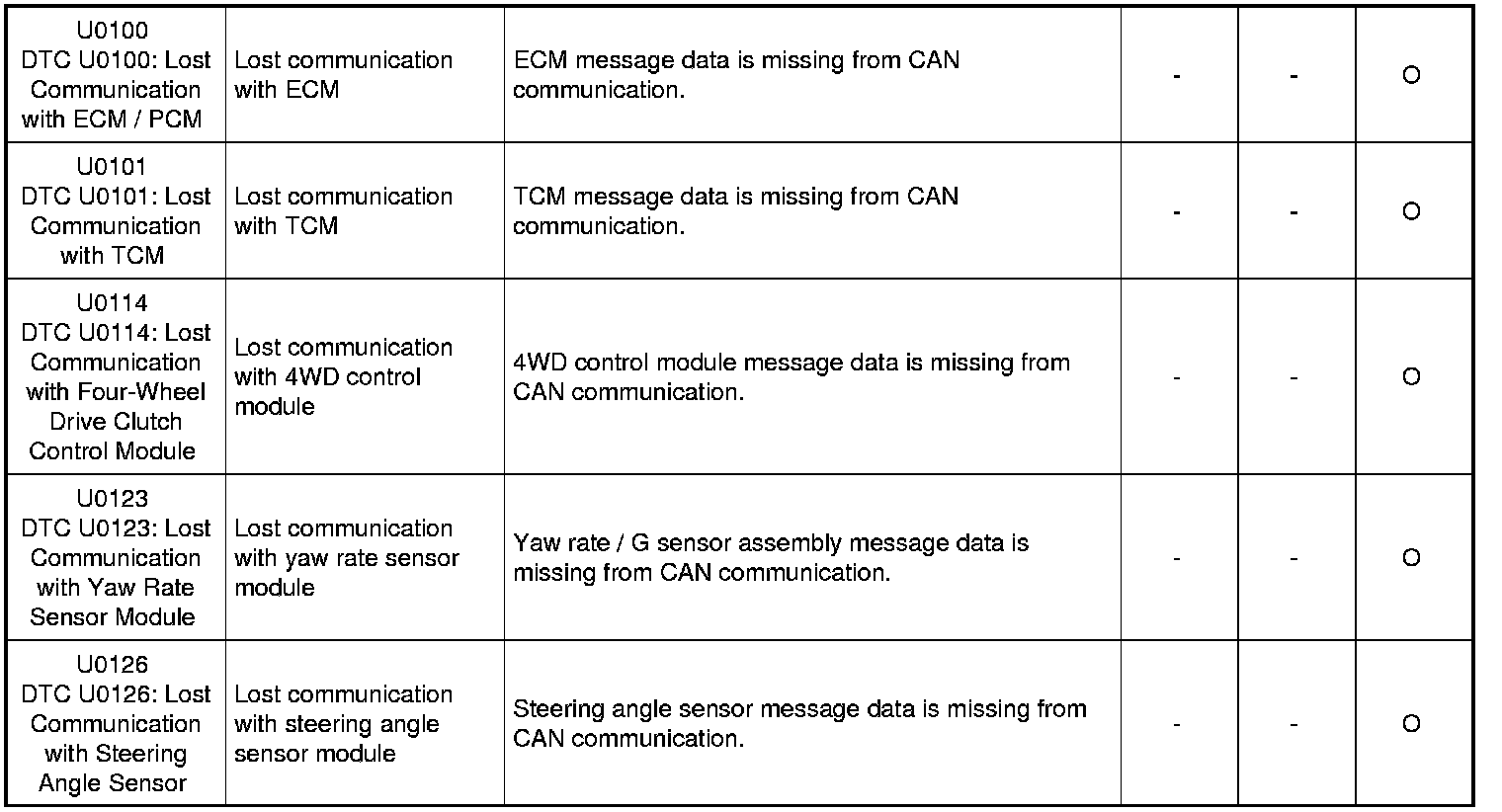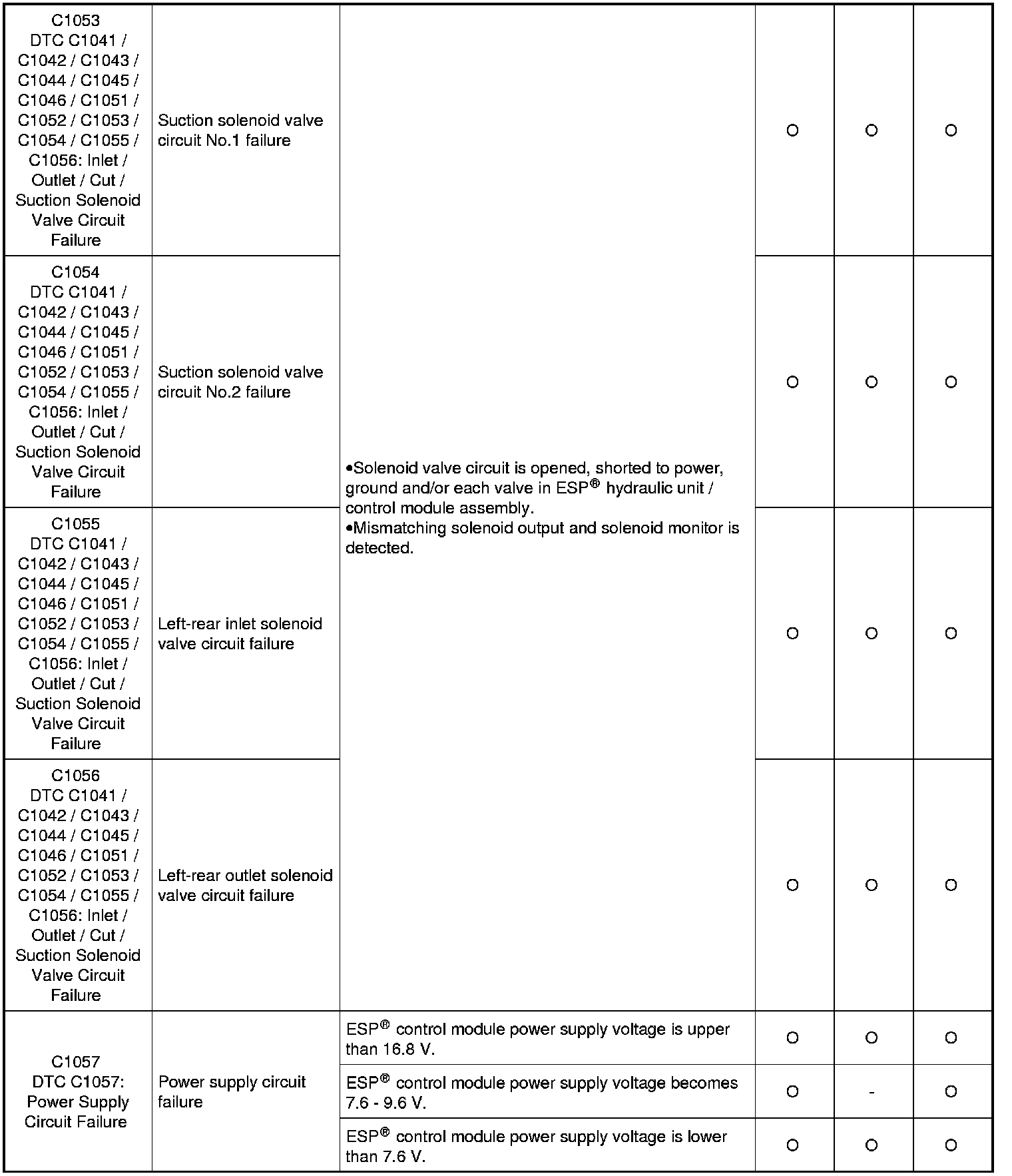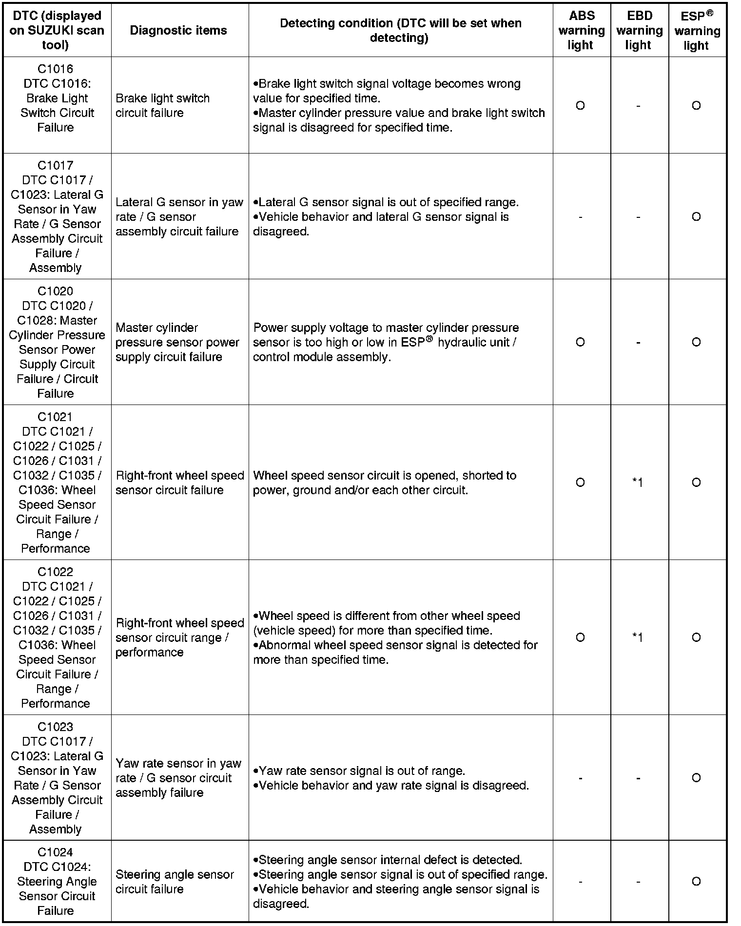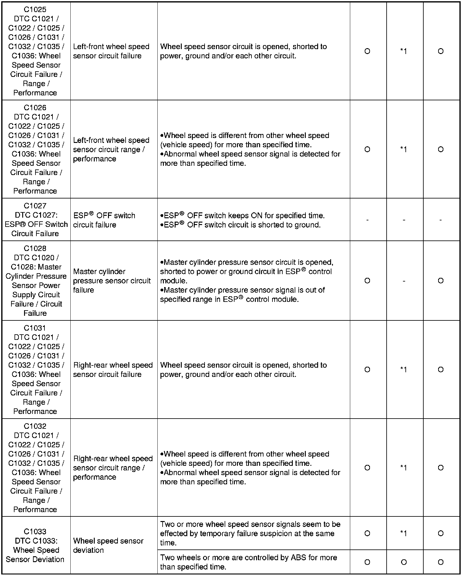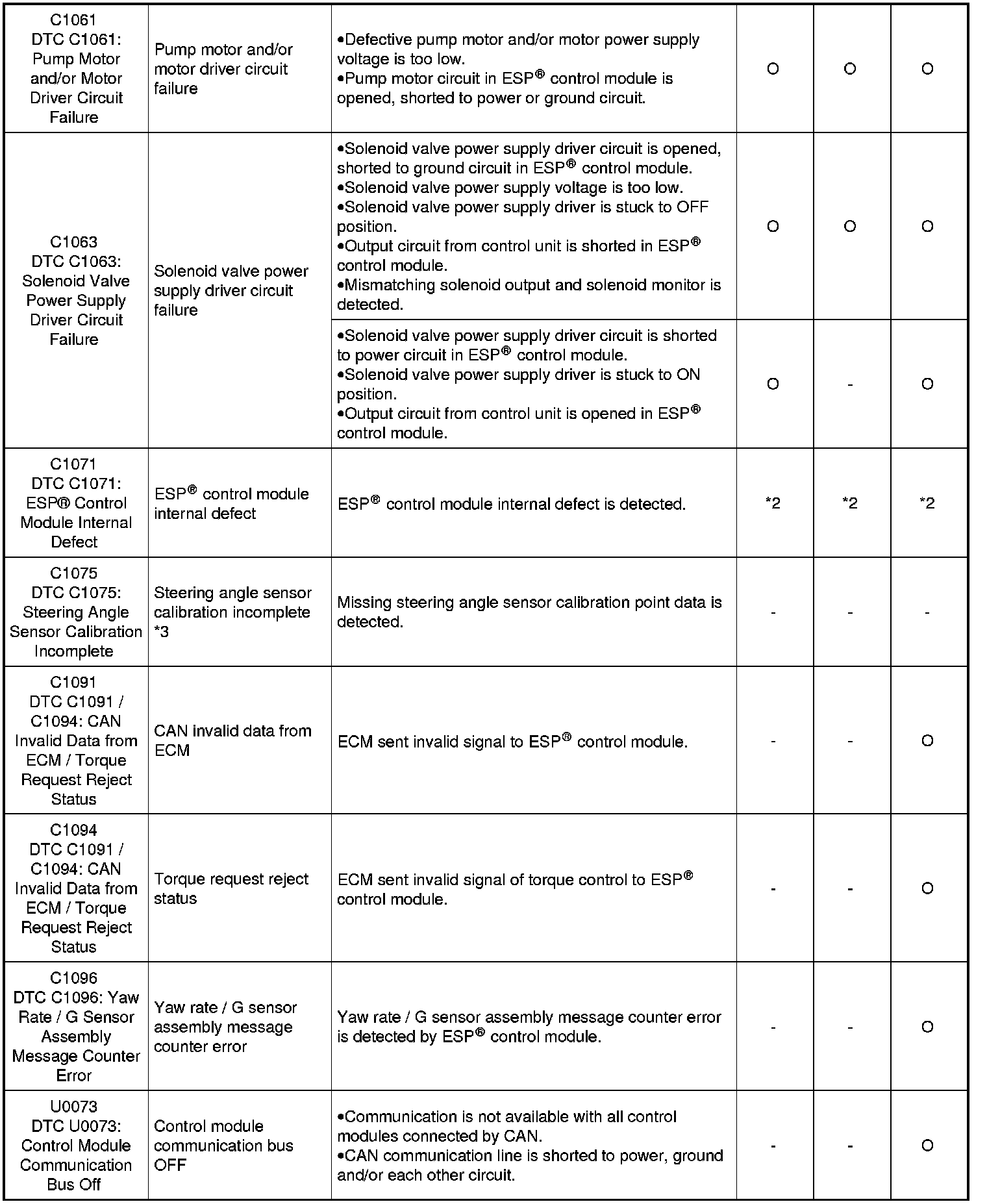 - "O" in ABS warning light, EBD warning light and ESP(R) warning light column of the above table means warning light is lit when DTC is detected.