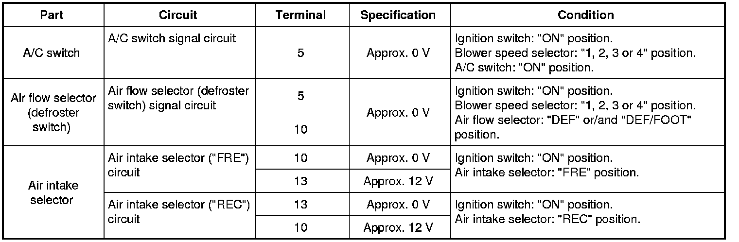A/C Switch, Air Flow Selector (Defroster Switch) and Air Intake Selector Inspection
