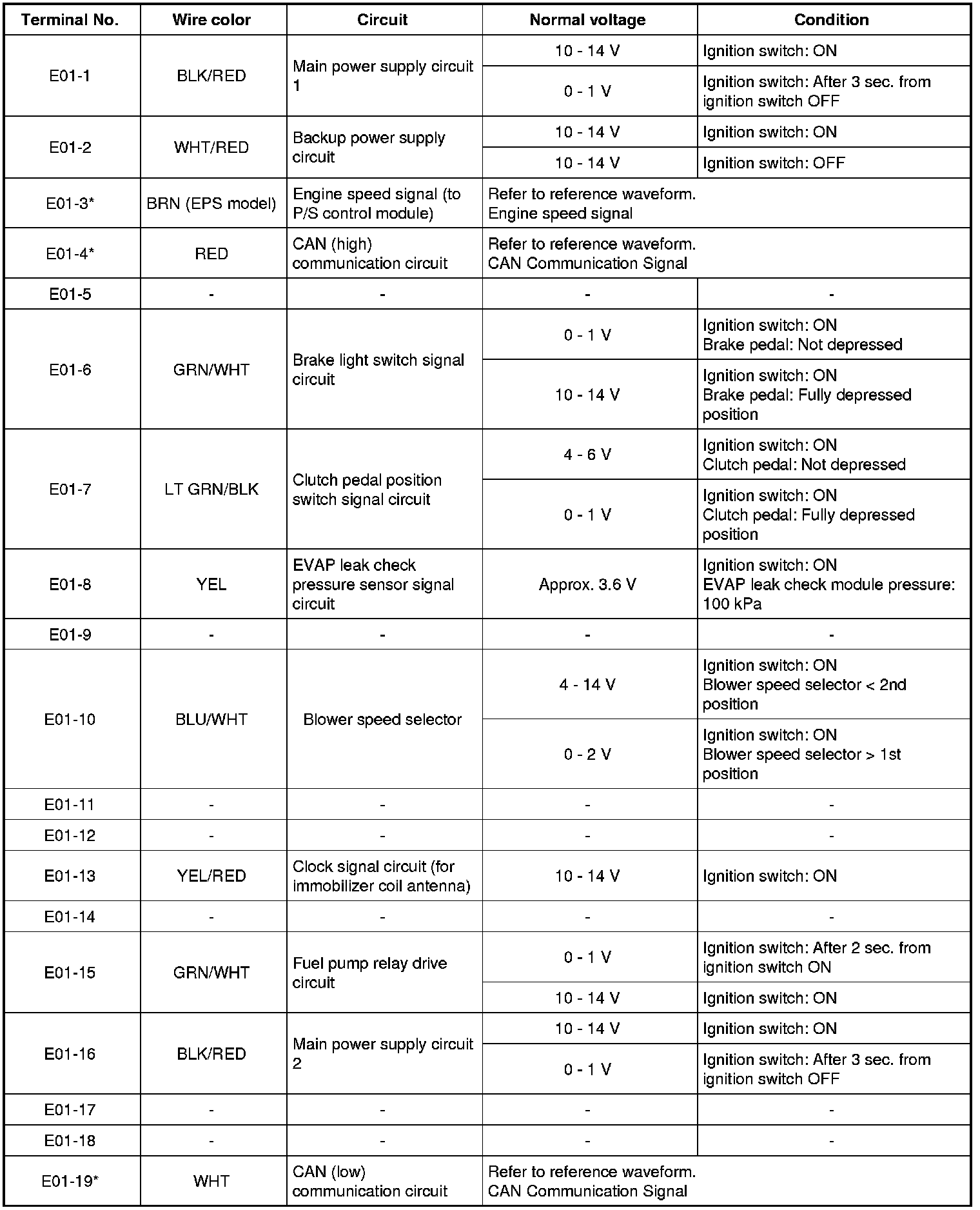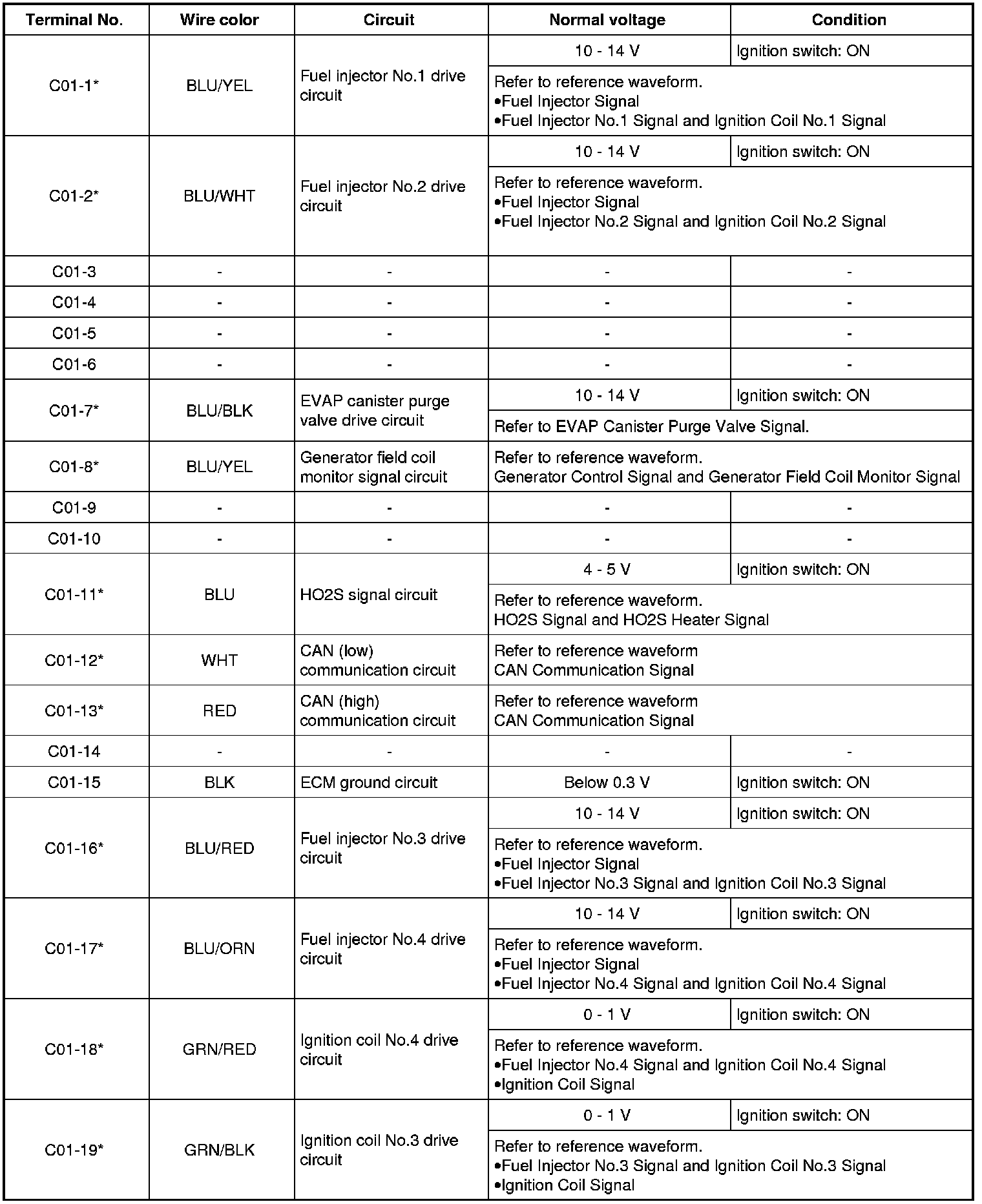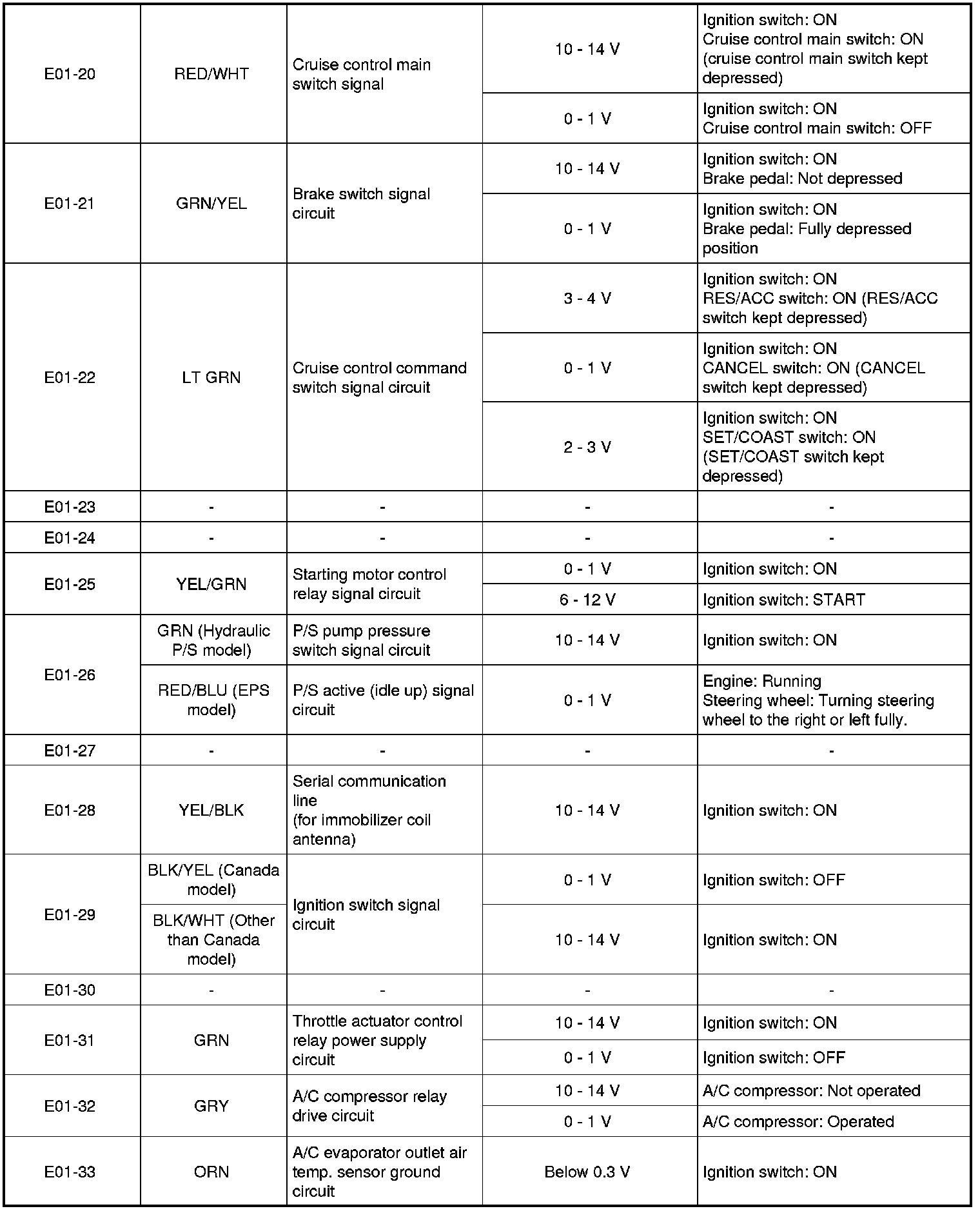 - As each terminal voltage is affected by battery voltage, confirm that it is 11 V or more when ignition switch is turned to ON position.