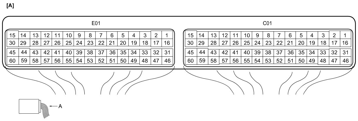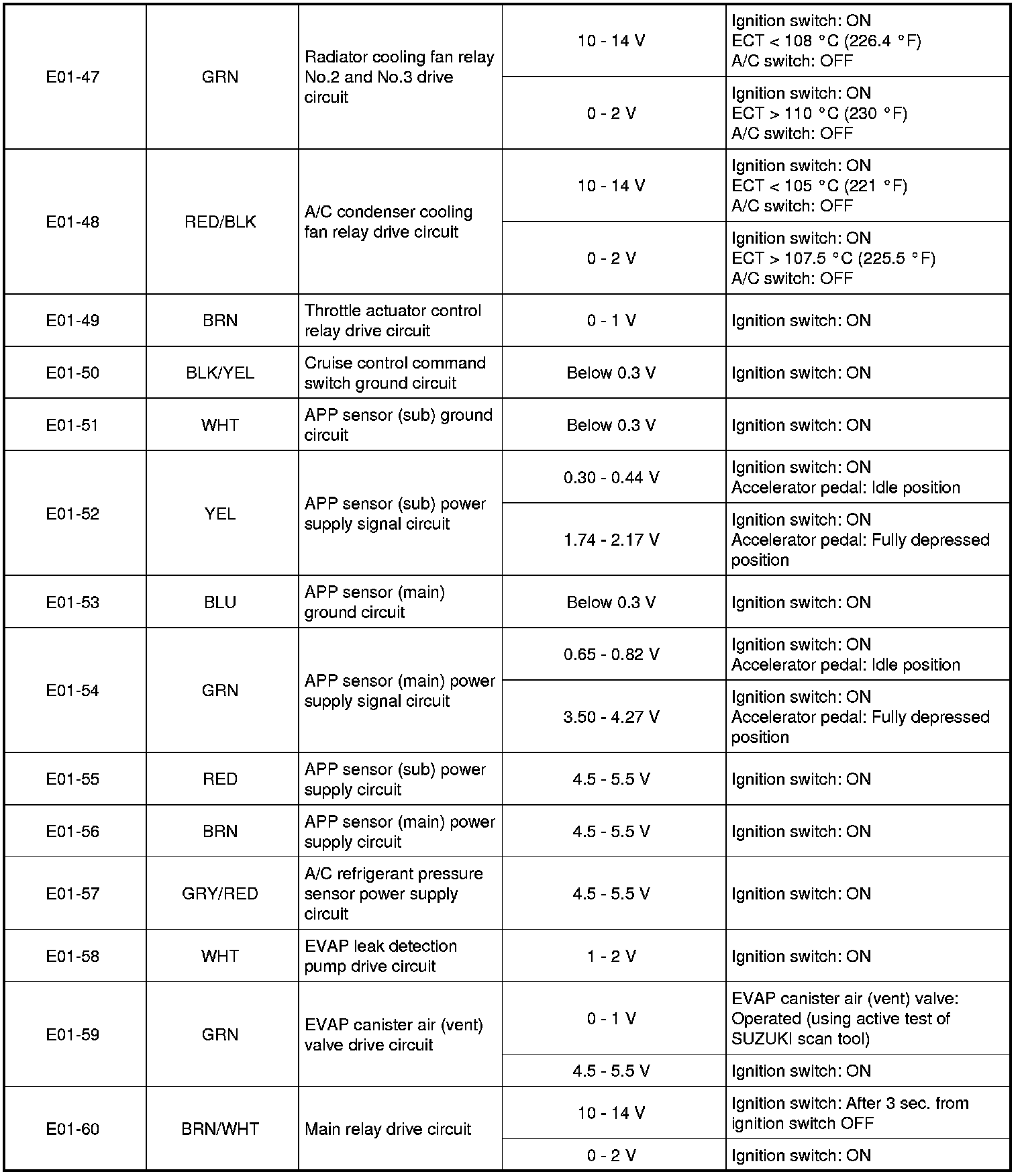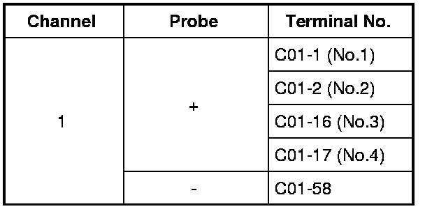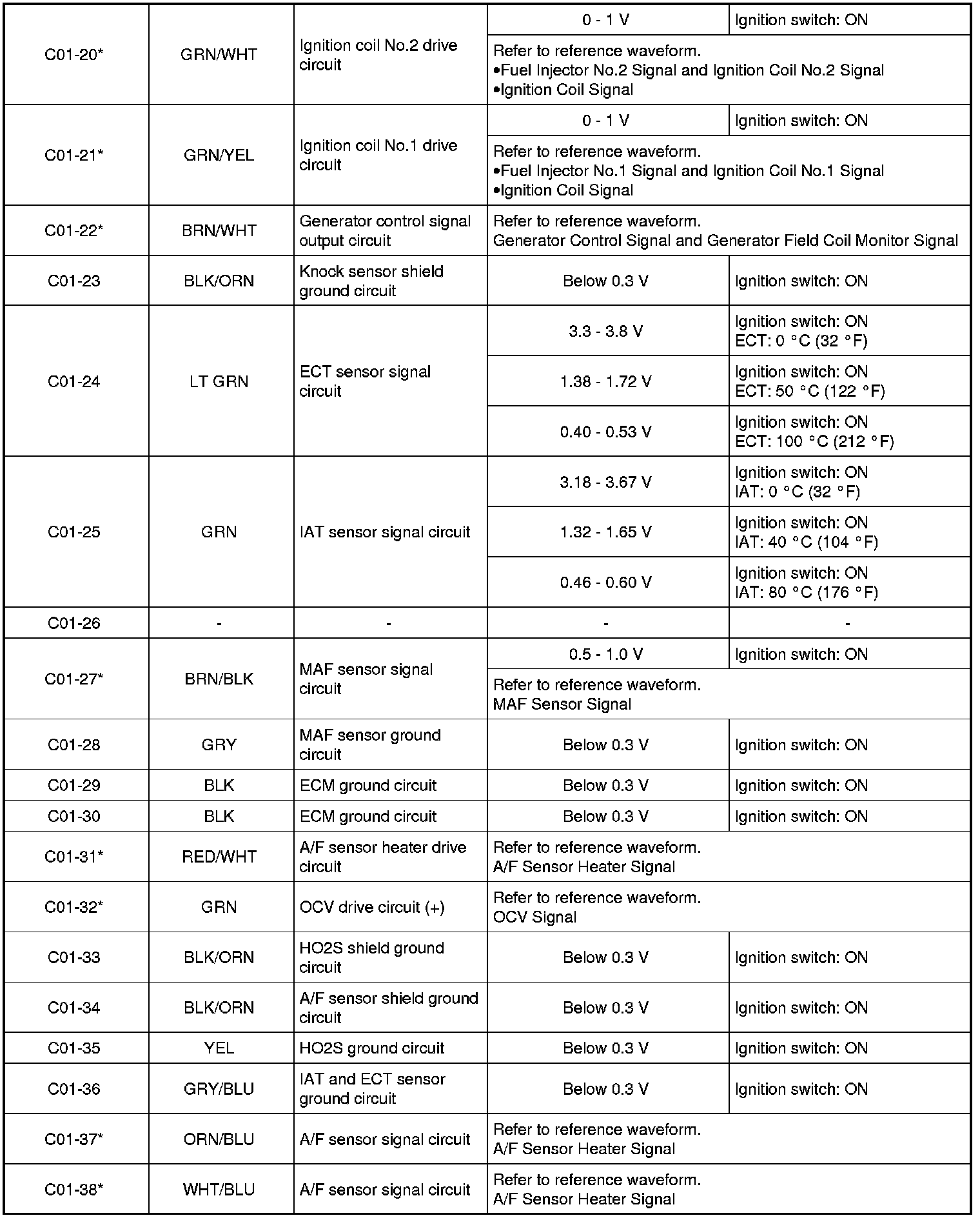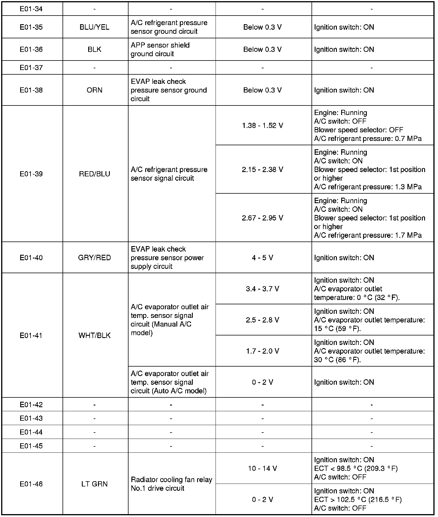 - As each terminal voltage is affected by battery voltage, confirm that it is 11 V or more when ignition switch is turned to ON position.