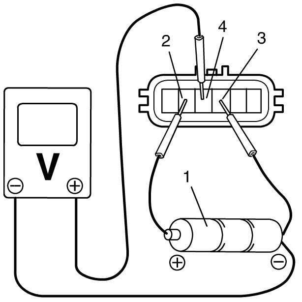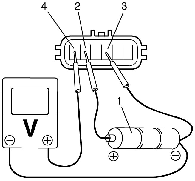 a) For TP sensor (main), arrange 3 new 1.5 V batteries (1) in series (check that total voltage is 4.5 - 5.0 V) and connect its positive terminal to "Vin" terminal (2) and negative terminal to "Ground" terminal (3) of sensor. Then using voltmeter, connect positive terminal to "Vout 1" terminal (4) of sensor and negative terminal to battery.