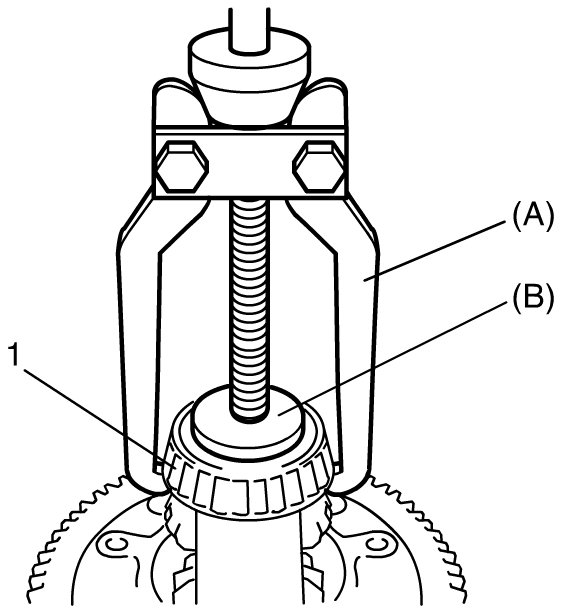 4) Press-fit right bearing (1) using special tools and hydraulic press.
