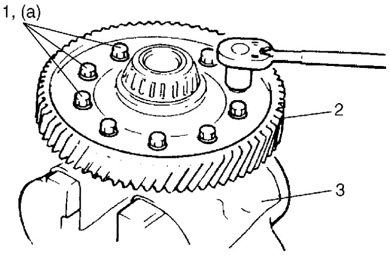 5) Hold differential assembly with soft jawed vise (3), install final gear (2) and then tighten new final gear bolts (1).