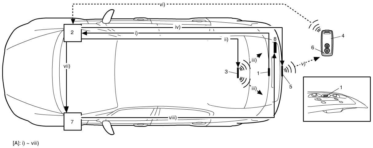 When the trunk lid request switch (1) is pushed, the keyless start control module (2) activates the trunk room antenna (3) to send out the radio wave in the trunk room to check if the remote controller (4) is in the trunk room or not. When the keyless start control module receives no signal from the remote controller (i.e., the remote controller does not exist in the trunk room), it activates the trunk lid antenna (5) to send the request signal out of the compartment.