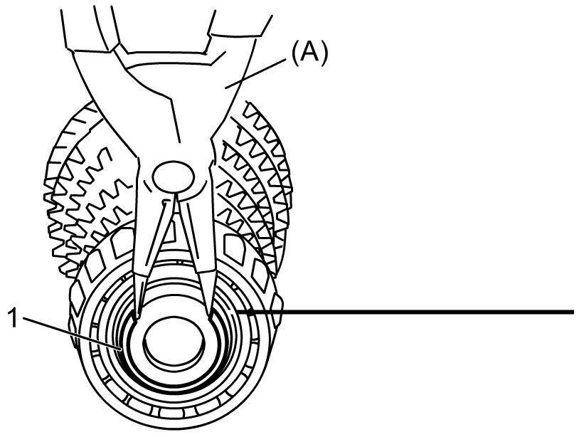 - Support lower speed synchronizer hub with special tool as shown in figure so that retainer of bearing cone will be free from compression.