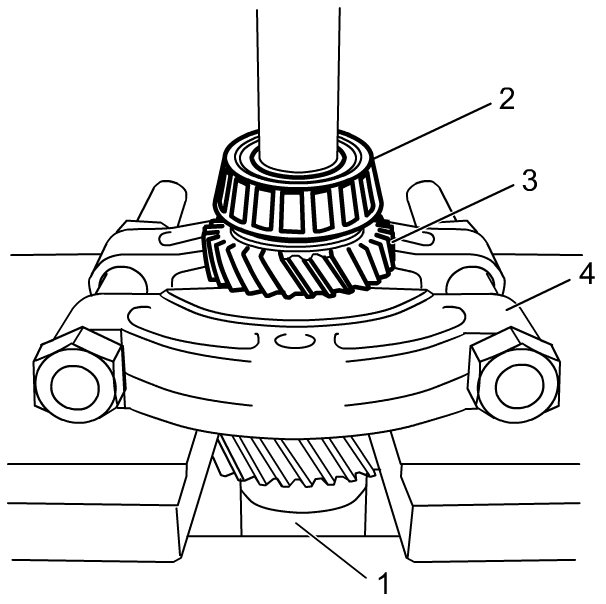 6) Apply puller (4) to reverse gear (3) and drive out low speed synchronizer sleeve & hub assembly (1), 1st gear (2) with reverse gear using hydraulic press.