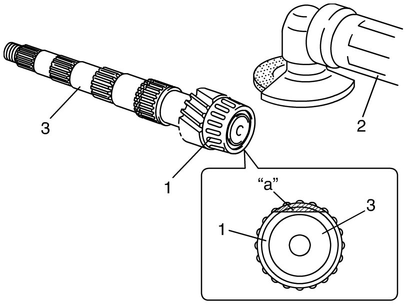 7) In order to remove right bearing (1) from countershaft, grind with a grinder (2) one part "a" of right bearing as illustrated till it becomes thin.