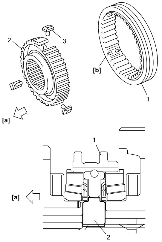 1) Fit low speed synchronizer sleeve (1) to hub (2) and 3 keys (3) as shown in figure.