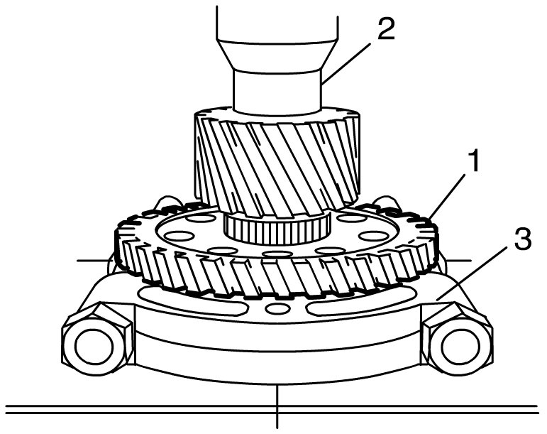5) Apply puller (3) to 2nd gear (2) and drive out 3rd gear (1) with 2nd gear using hydraulic press.
