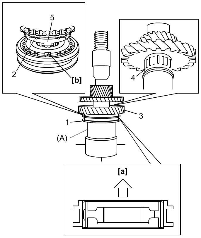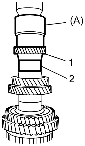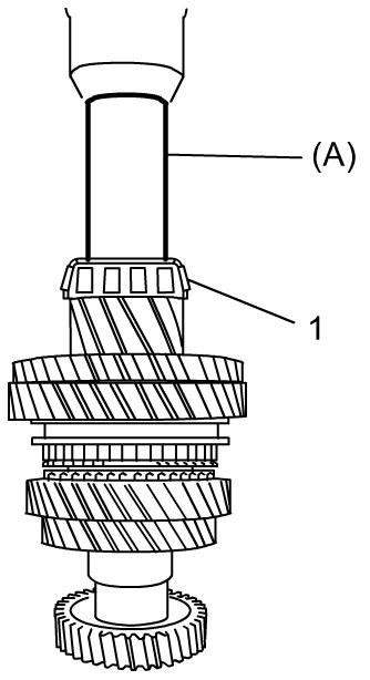 4) Install 1st gear needle bearing (4), apply oil to it, then install 1st gear and 1st gear synchronizer ring (2).