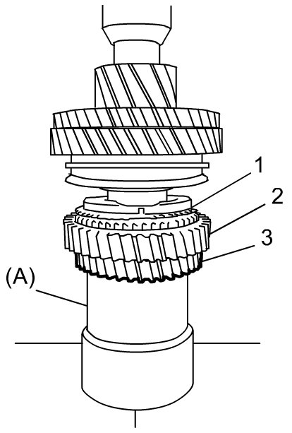 3) Apply puller (3) to 4th gear (2) and drive out 5th gear (1) with 4th gear using hydraulic press.