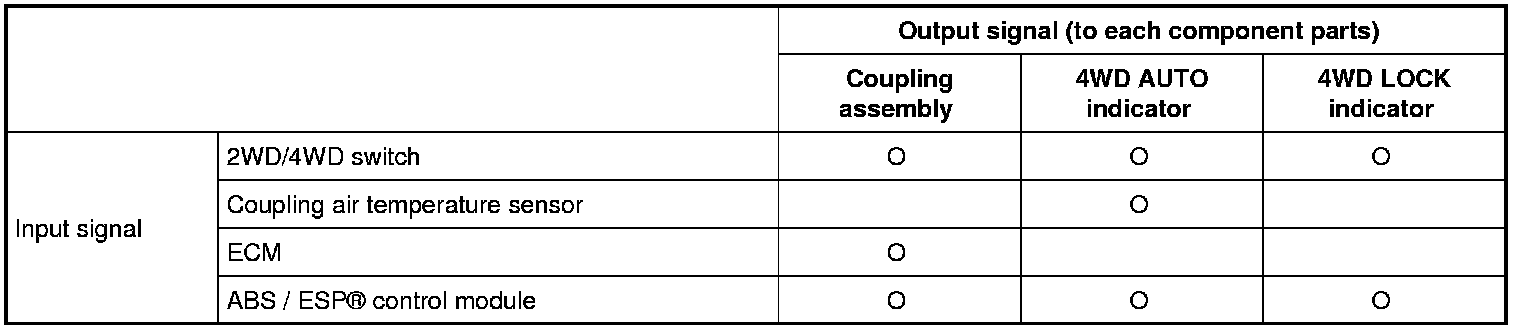 4WD control module outputs the following signals to coupling assembly, indicators, according to the 2WD/4WD switch operation.