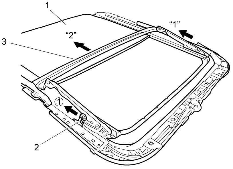 6) Remove No. 1 pieces (1) and then pull out sunshade (2) from guide rails (3).