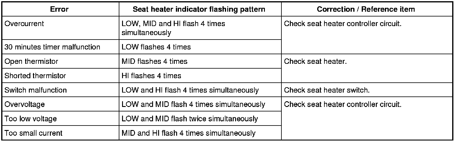 The following table shows fault items that can be identified through diagnosis and also their codes represented by flashing of seat heater indicator(s).