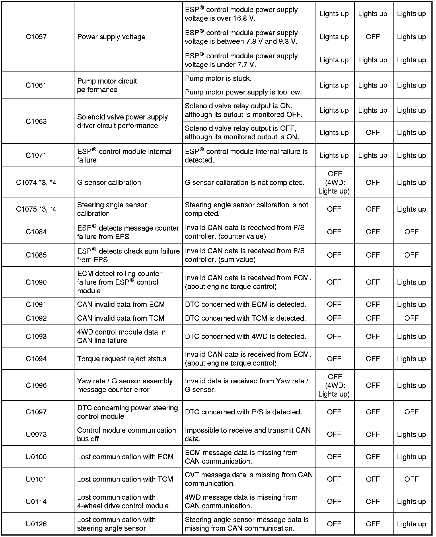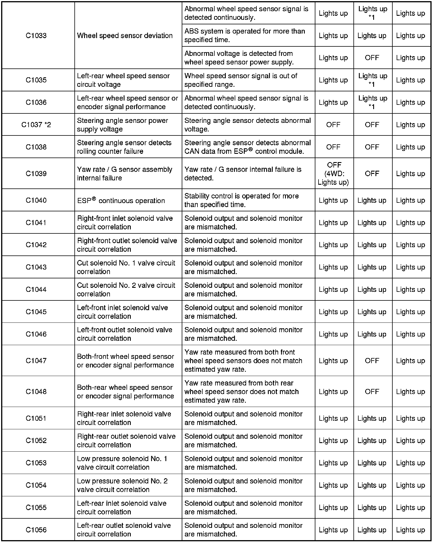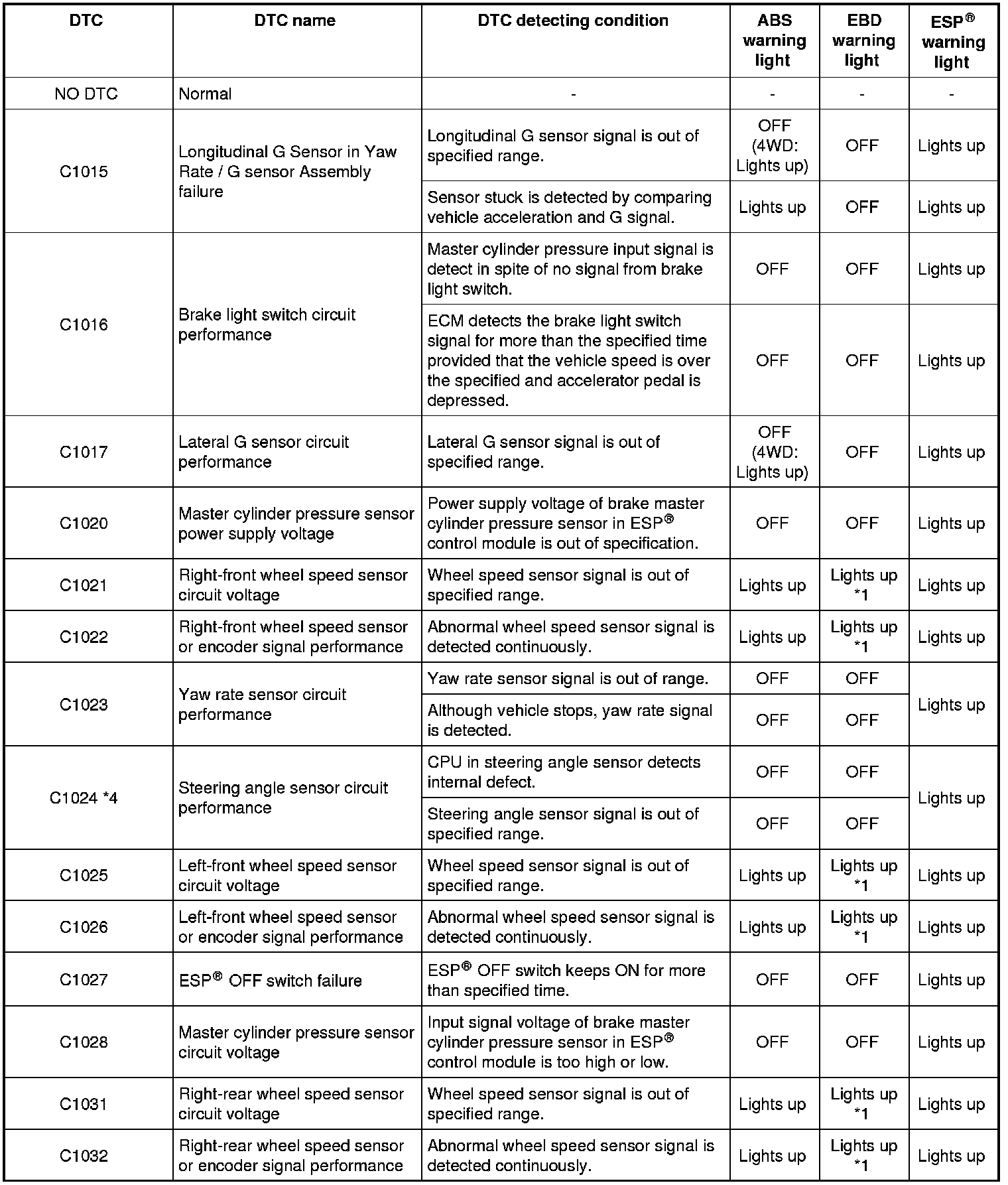 - *1: If three or more wheel speed sensors are defective, ABS warning light, EBD warning light (brake warning light) and ESP(R) warning light are lit and all the control functions are deactivated. If one or two wheel speed sensors are defective, ABS warning light and ESP(R) warning light are lit and ABS and traction control / stability control are deactivated.