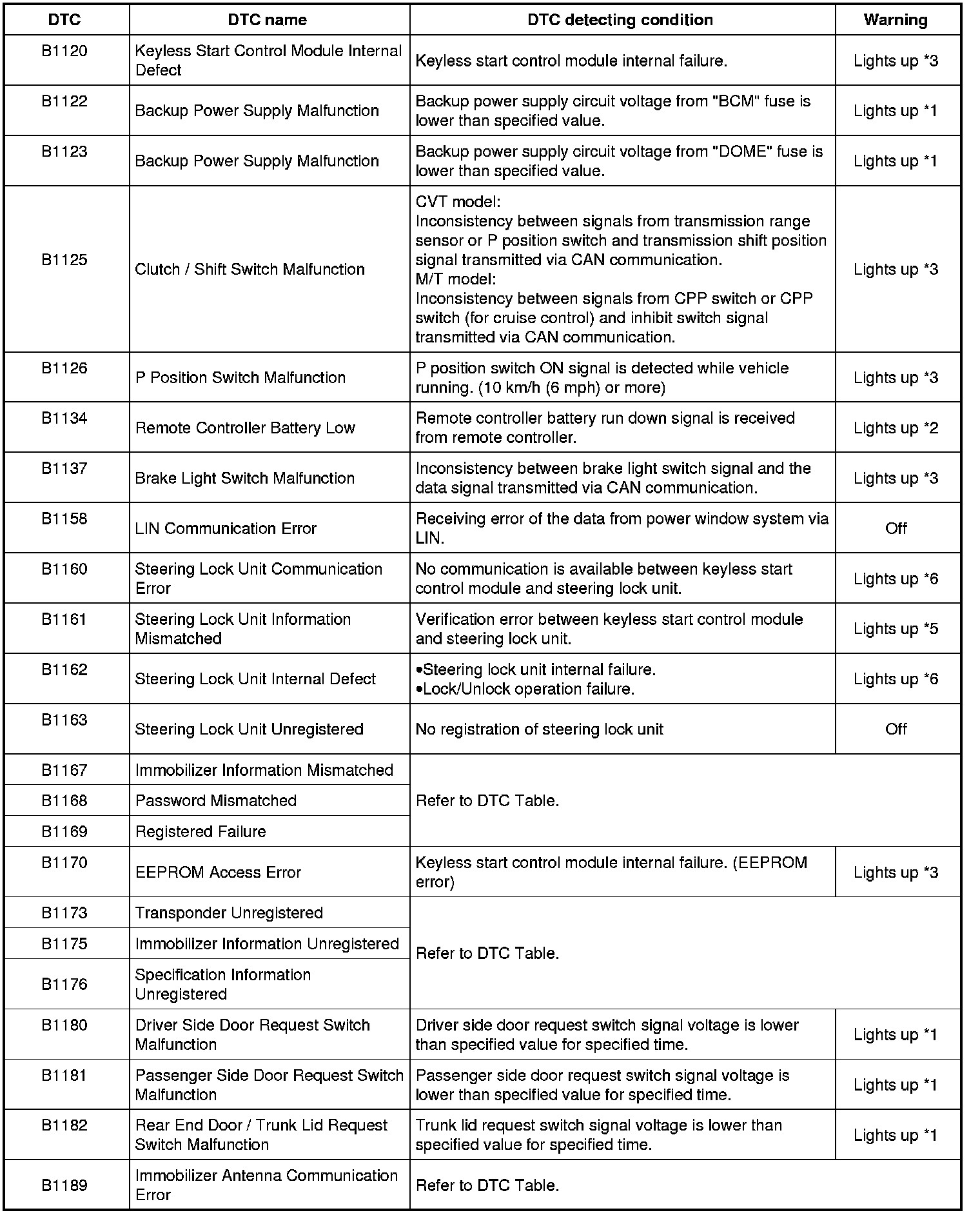- *6: Immobilizer indicator light lights up. (It stays on for 15 minutes when steering lock fails, and for 5 seconds when steering unlock fails and ignition mode is in mode other than "ON". Stays on continuously when ignition mode is in "ON"). "SERVICE STEERING LOCK SYSTEM" or "TRN. STEERING WHEEL TO RELEASE LOCK" is shown in Information display.