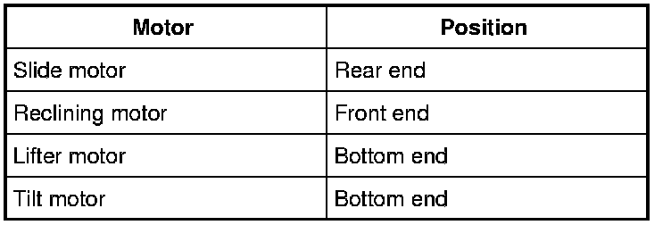 1) Operate each motor, one at a time, to move seat to position indicated in the following table and hold seat at each position for at least 5 seconds.